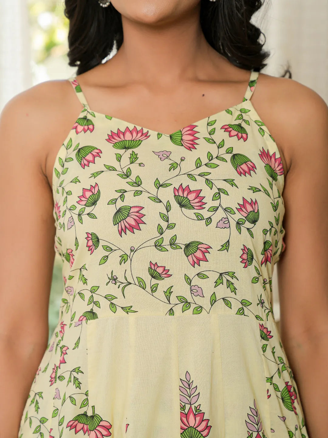 Yellow Pure Cotton Sleeveless Strappy Anarkali Kurta Dupatta Set