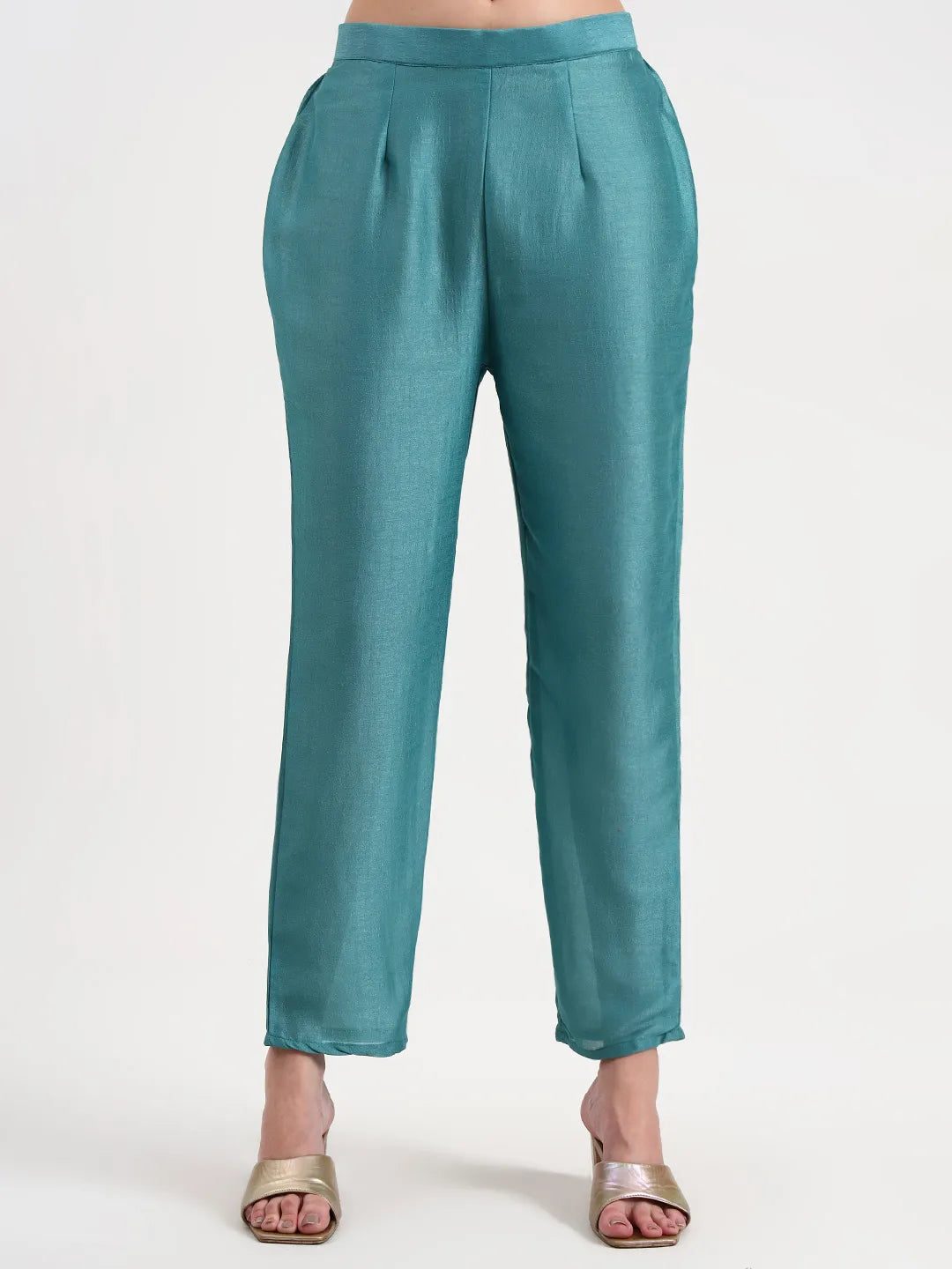 Turquoise Blue Silk Blend Vichitra Kalidaar Anarkali Kurta Trouser Dupatta Set