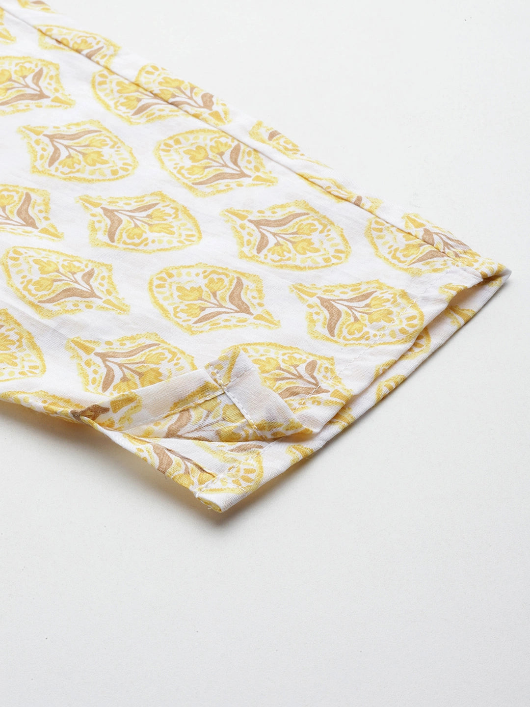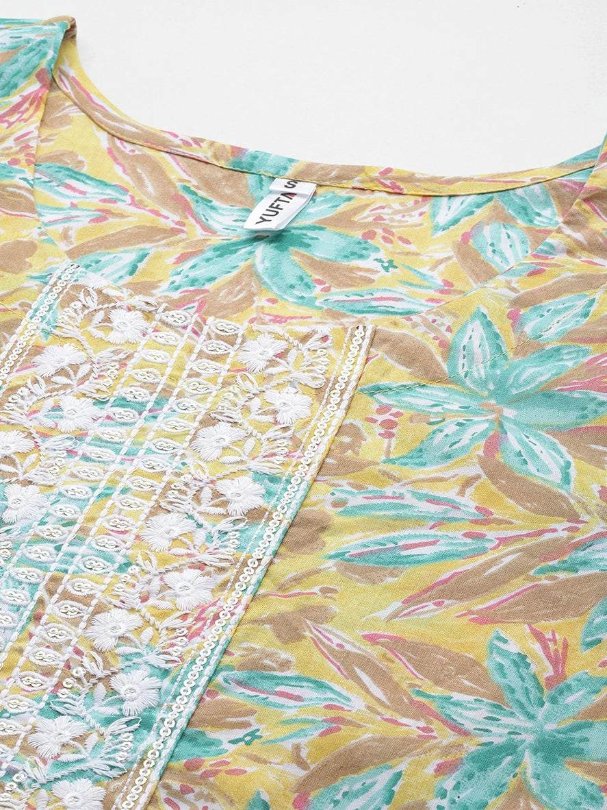 Yellow Floral Embroidered Sequinned Pure Cotton Kurta with Trousers & With Dupatta Set