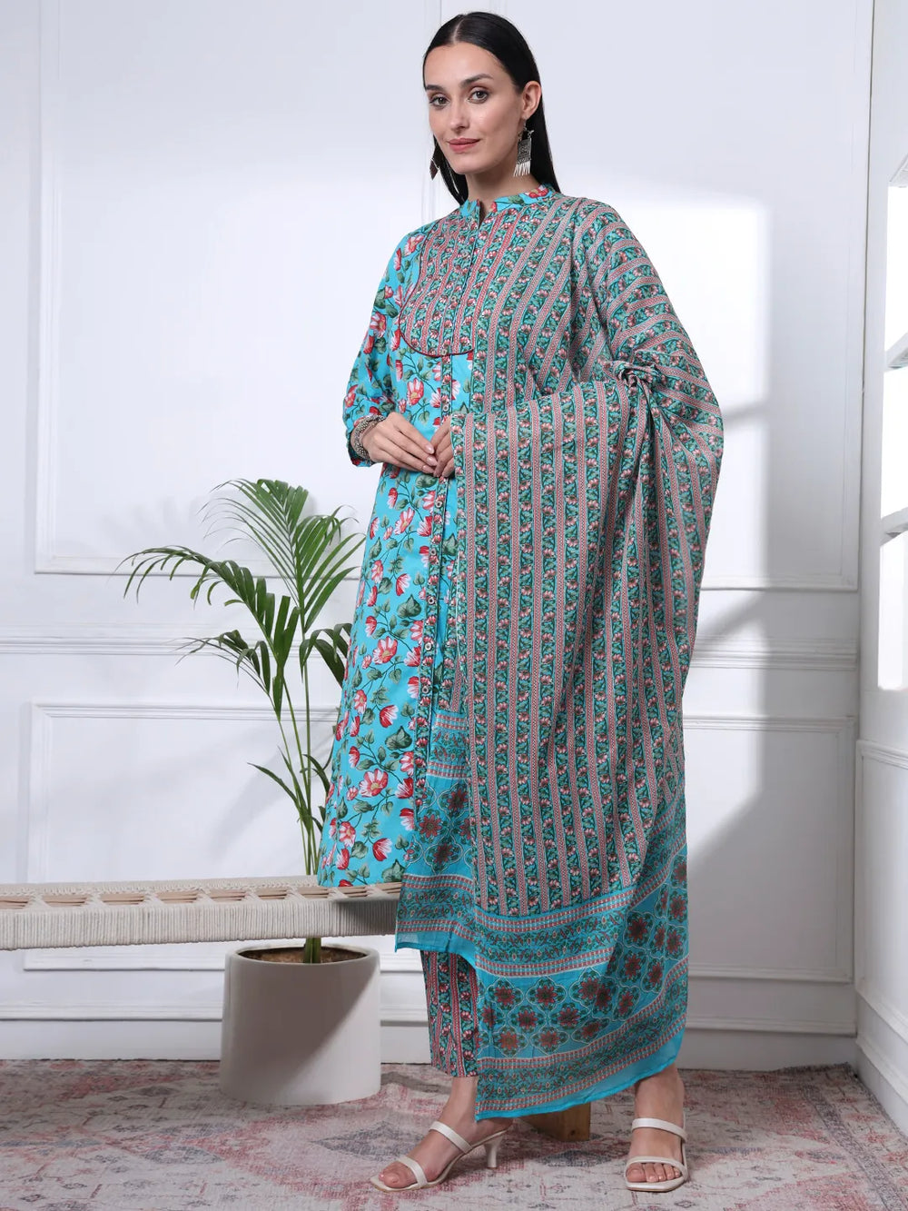 Turquoise Blue Cotton Floral Print Sequins Work Kurta Pants Dupatta Set