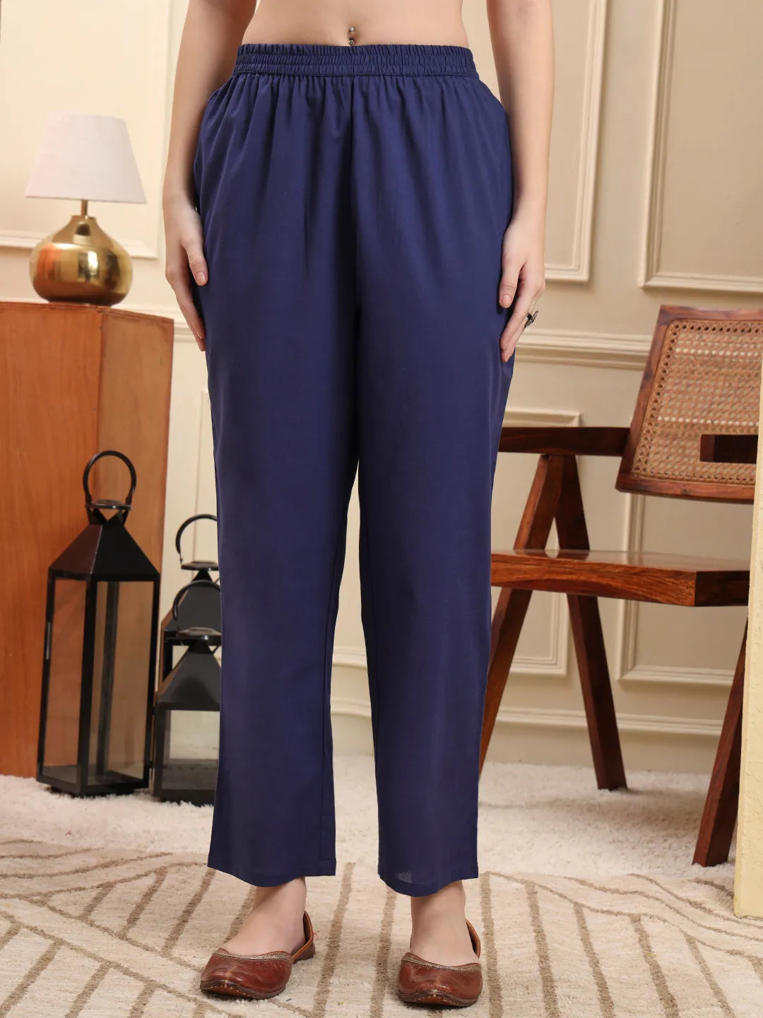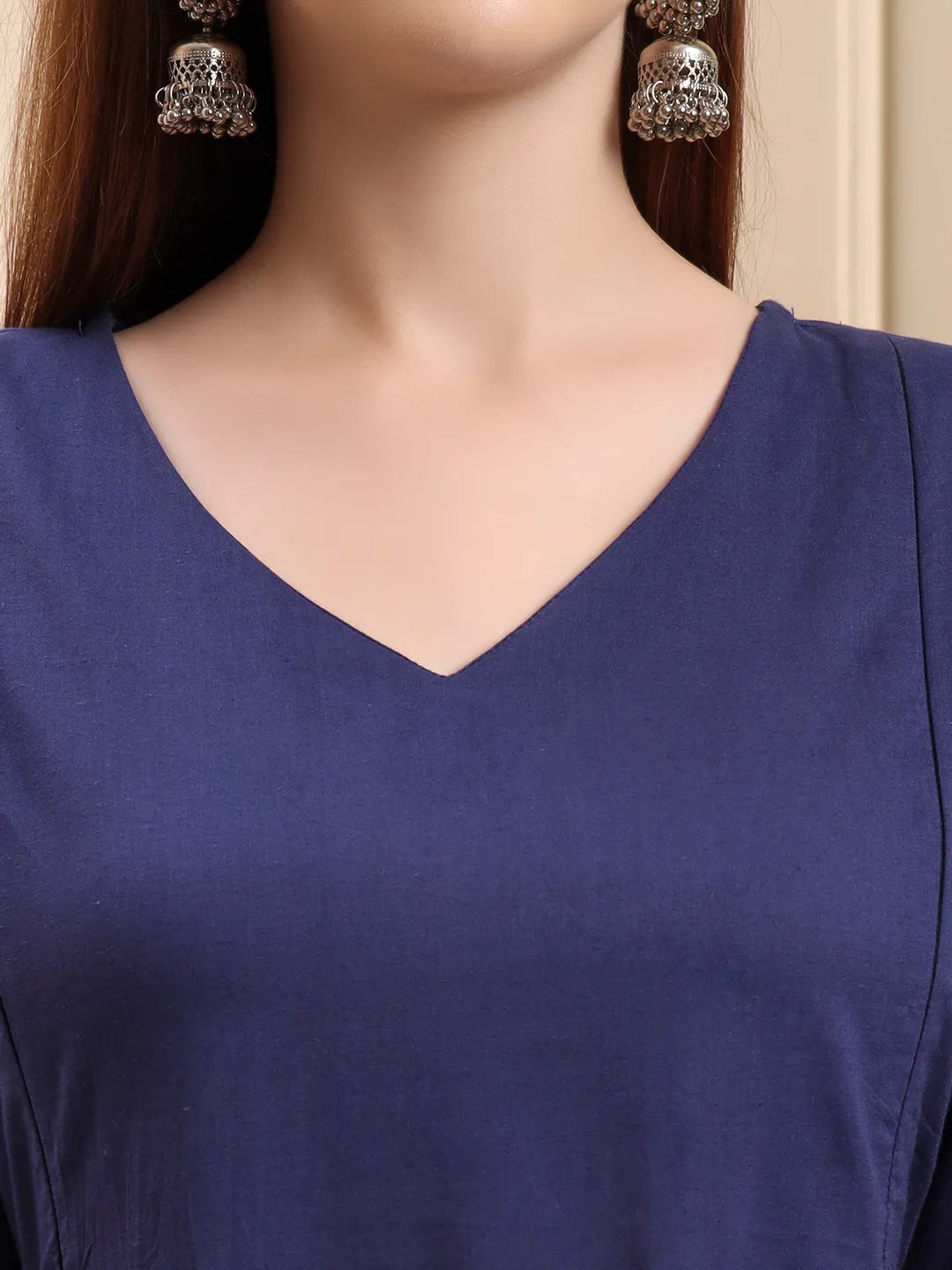 Blue Solid A-line kurta Trouser Dupatta Set kurta Design Maternity A-line Shape Three quarter sleeve V-Neck Calf Length kurta Flared Hem Machine Weave Cotton Trouser Design:One pocket Pure Cotton Trouser Slip-On Waist Size & Fit Material & Care Pure Cotton Dry Clean