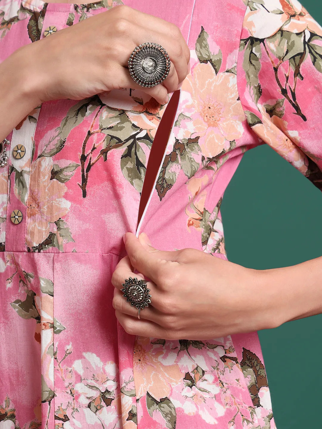 Pink Floral Print A-Line Maternity Kurta Trouser Dupatta Set
