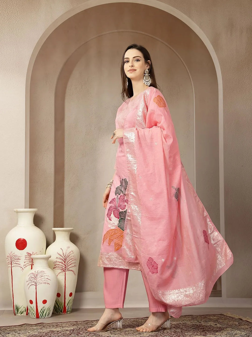 Peach Chanderi Silk Floral Straight Kurta Trouser Dupatta Set