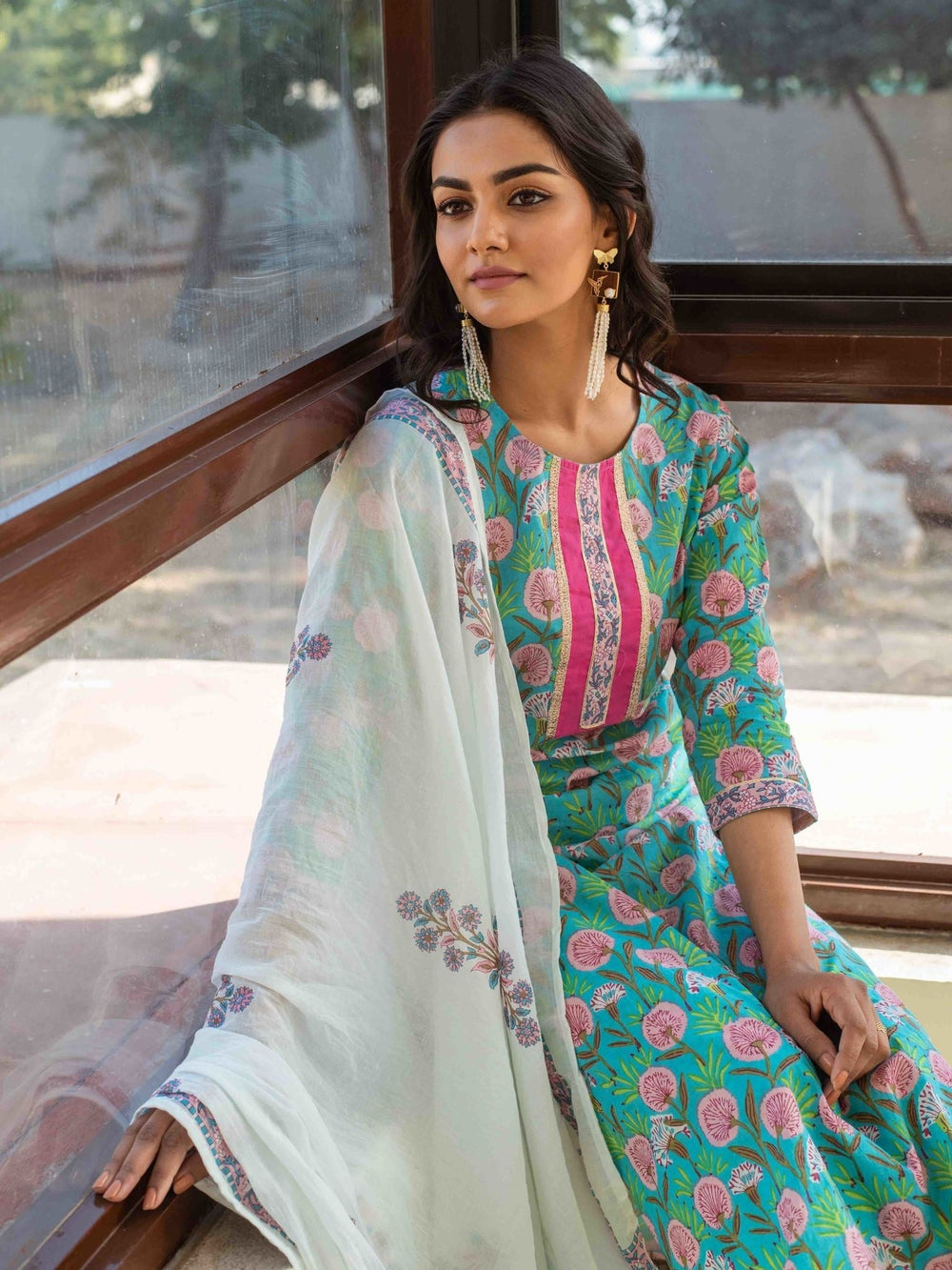 Blue Floral Embroidered Cotton Kurta Dupatta Set