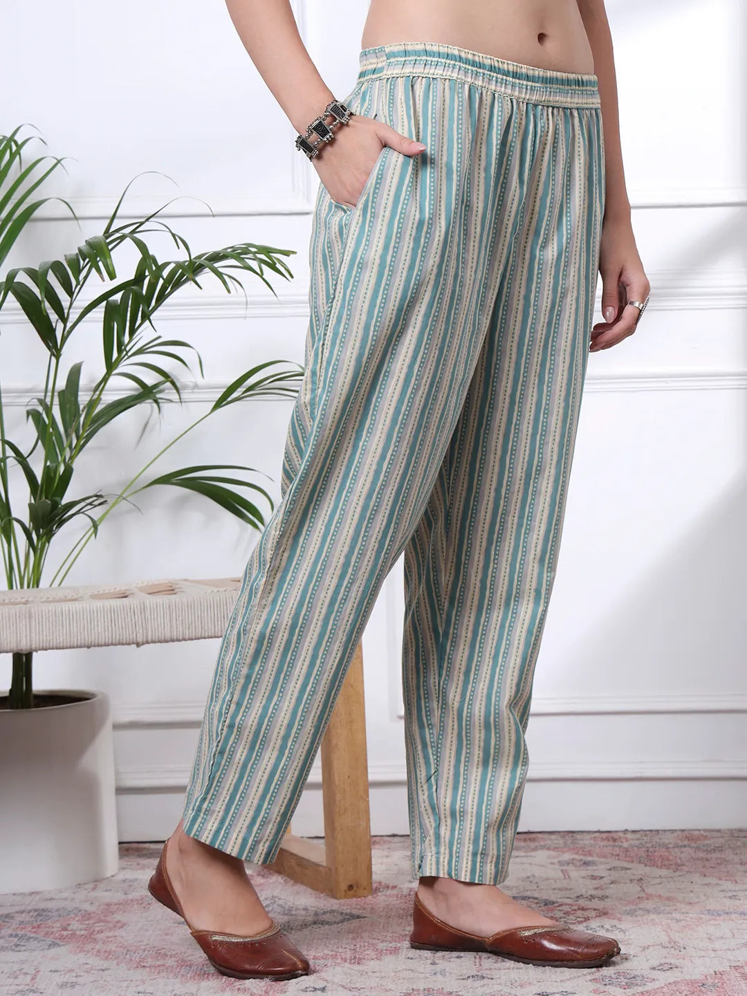 Sea Green And White Floral Print Anarkali Kurta Trouser Dupatta Set
