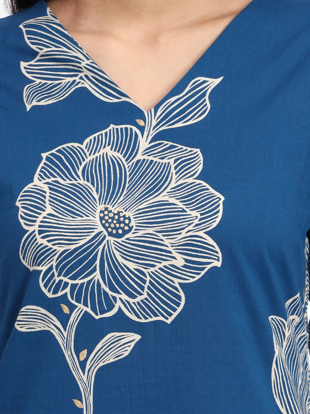 Blue Floral Print Straight design Kurta Trouser Dupatta Set Kurta Design Straight Shape Three quarter Regular Sleeves V-Neck Calf Length Side Slits kurta Straight Him Machine Weave Pure cotton Trouser Design: Blue Solid Trouser One Pocket Elastic waist Dupatta Blue Pure cotton Printed Border Size & Fit Material & Care Pure cotton Hand Wash