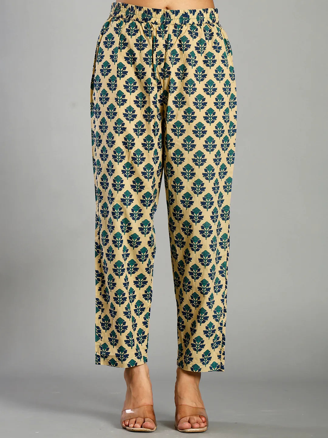 Blue And Cream Ethnic Motifs Cotton A-Line Kurta Trouser Dupatta Set