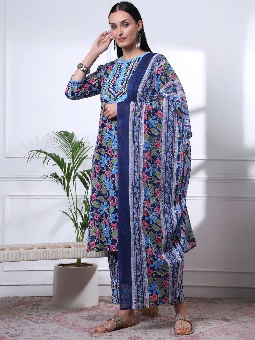 Blue Floral Sequins-Work Pure Cotton Kurta Dupatta Pant Set