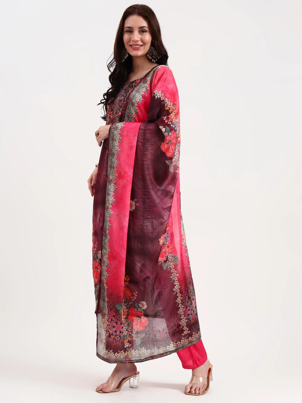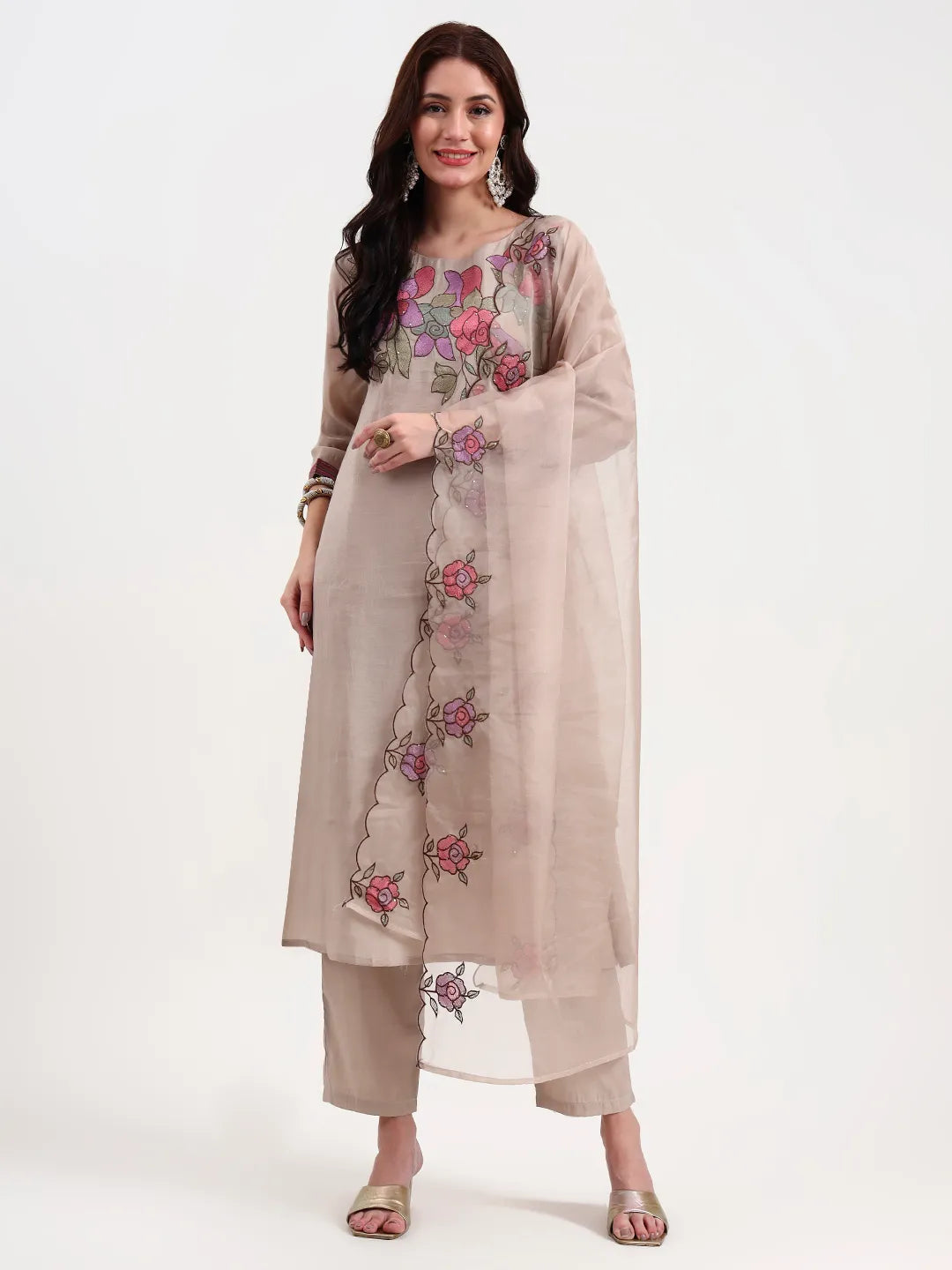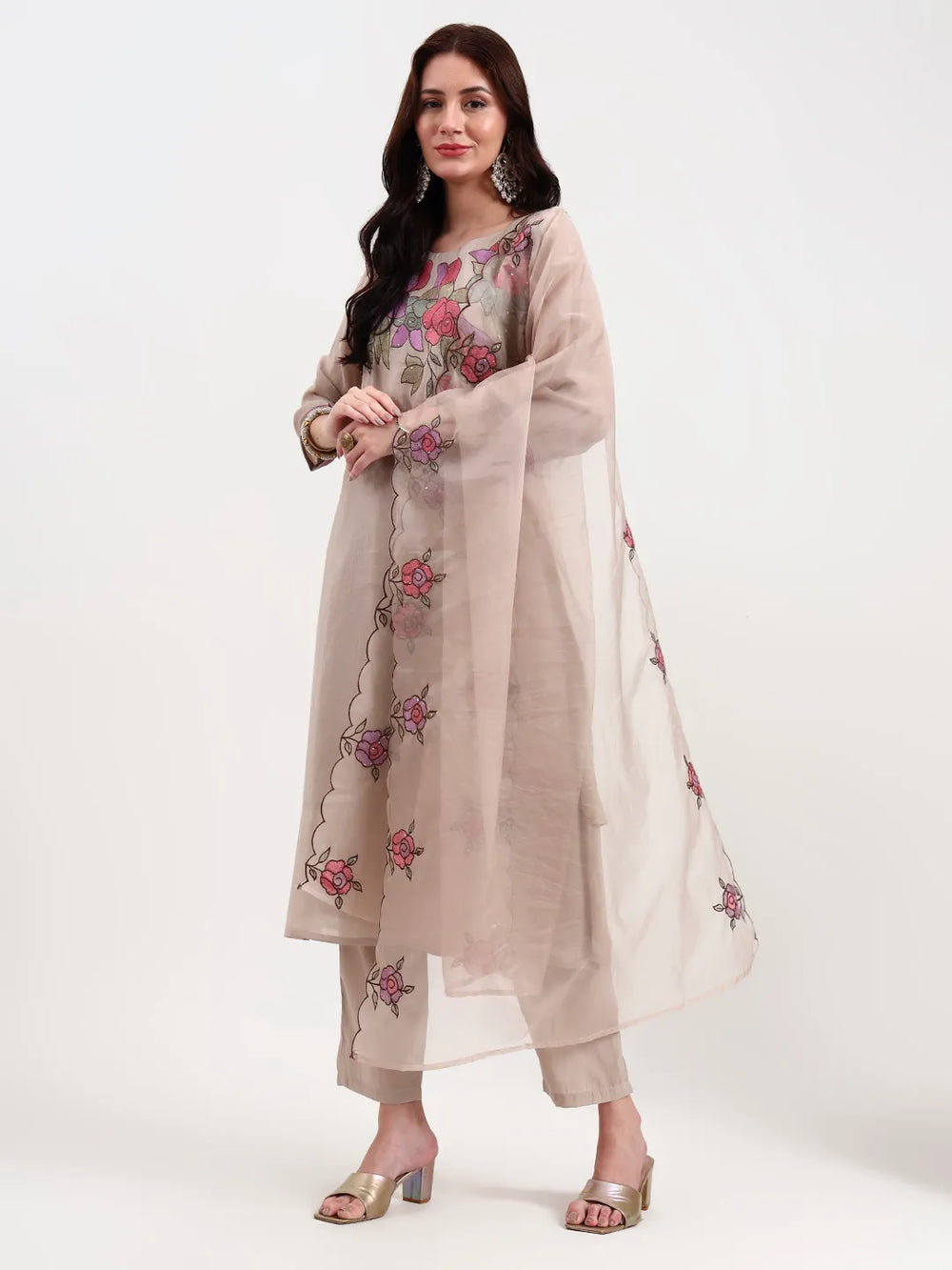 Cream And Pink Silk Crepe Sequins Work Straight Kurta Dupatta Pant Set