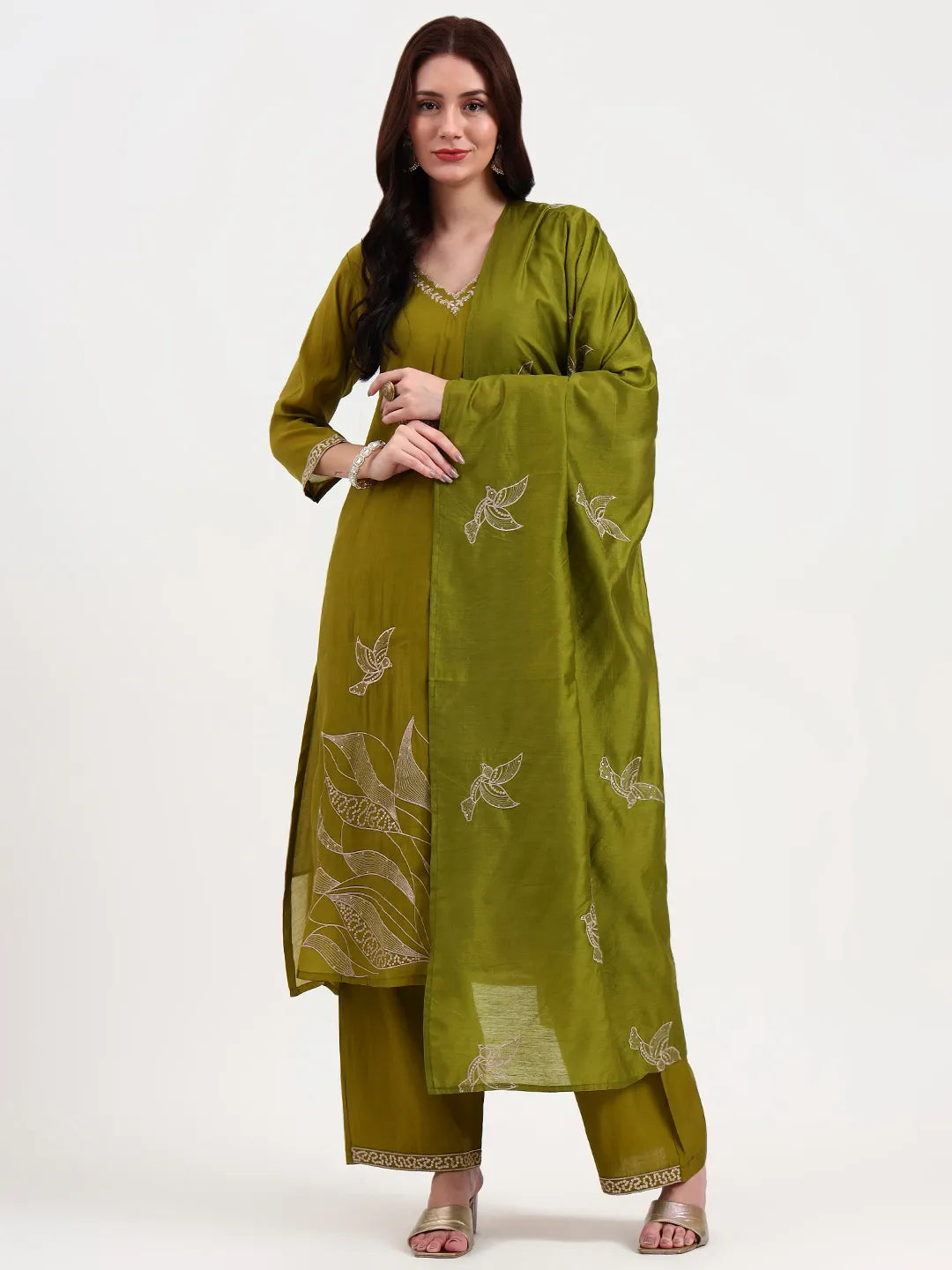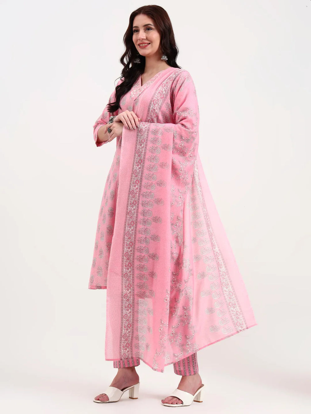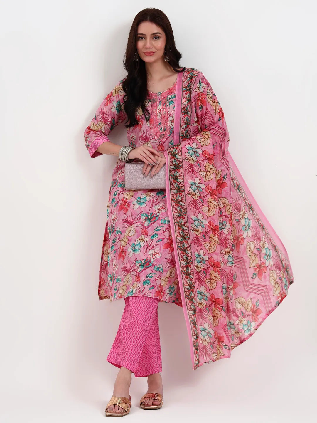Cream And Pink Silk Crepe Sequins Work Straight Kurta Dupatta Pant Set