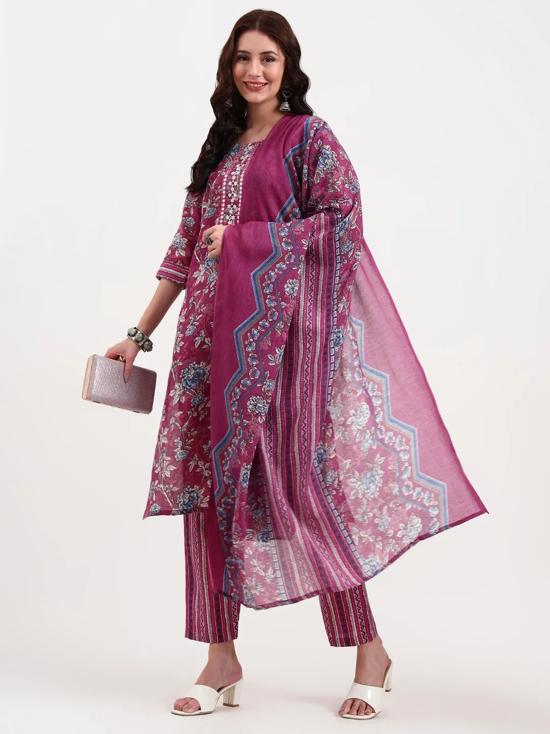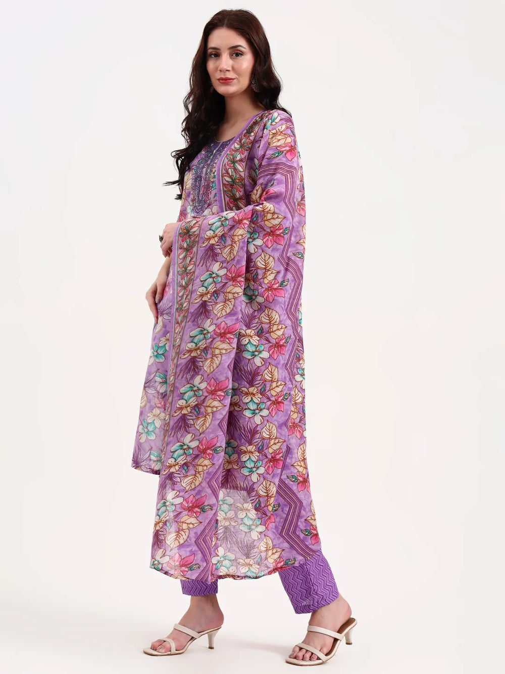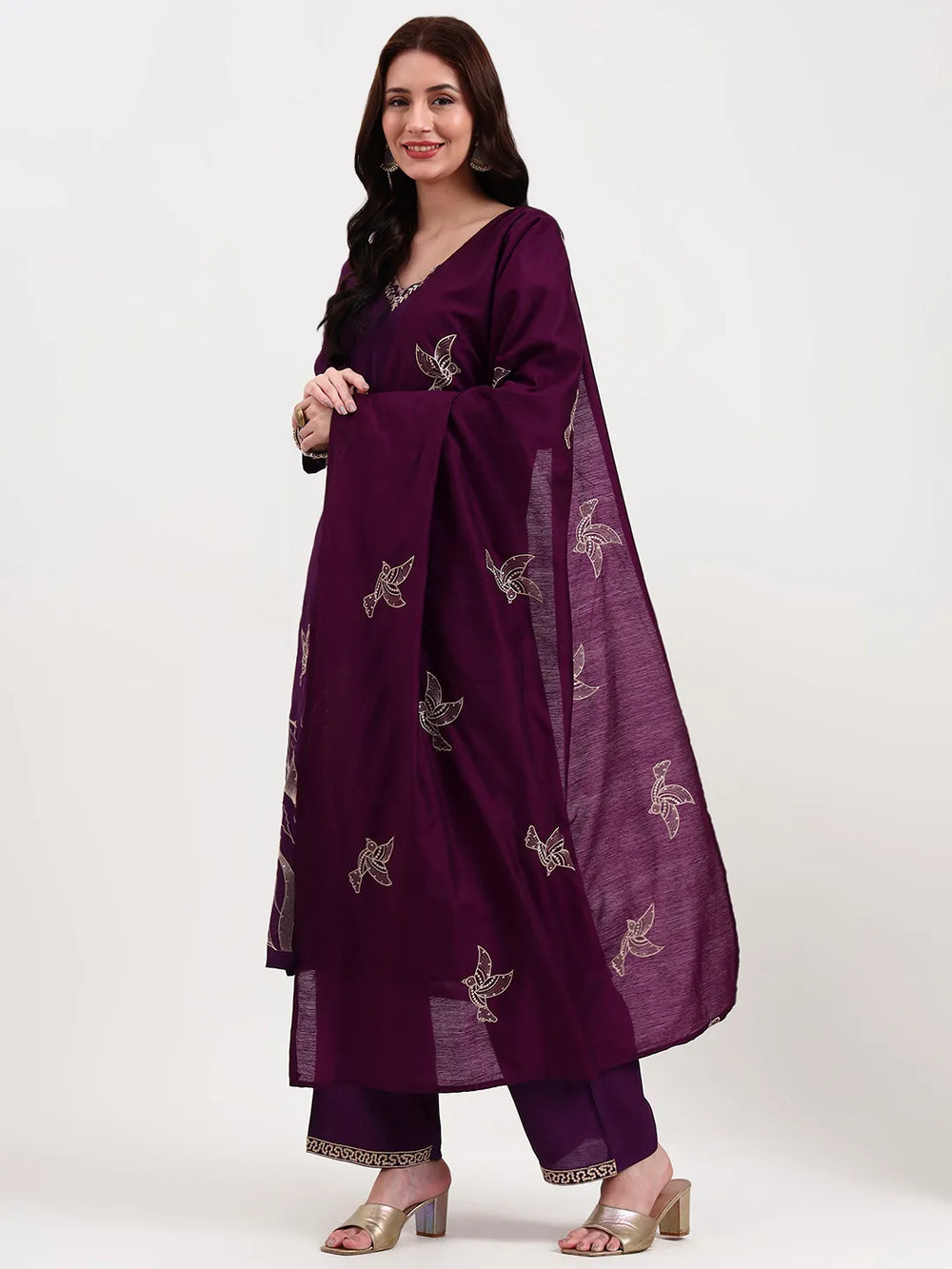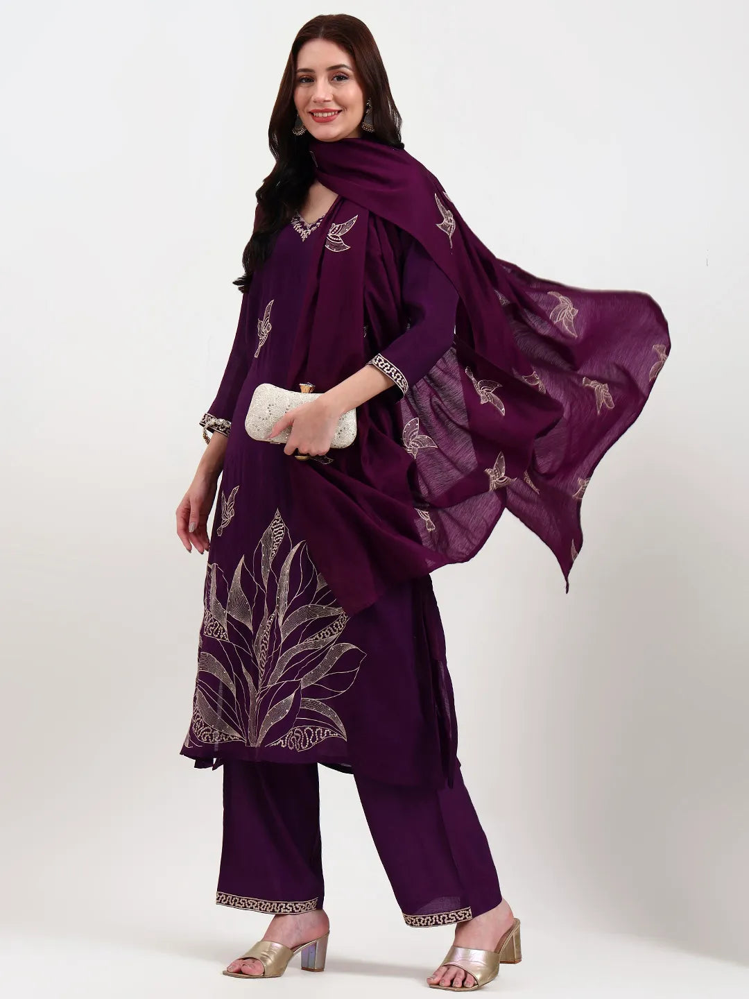 Purple Dori Embroidery A-Line Kurta Trouser Dupatta Set