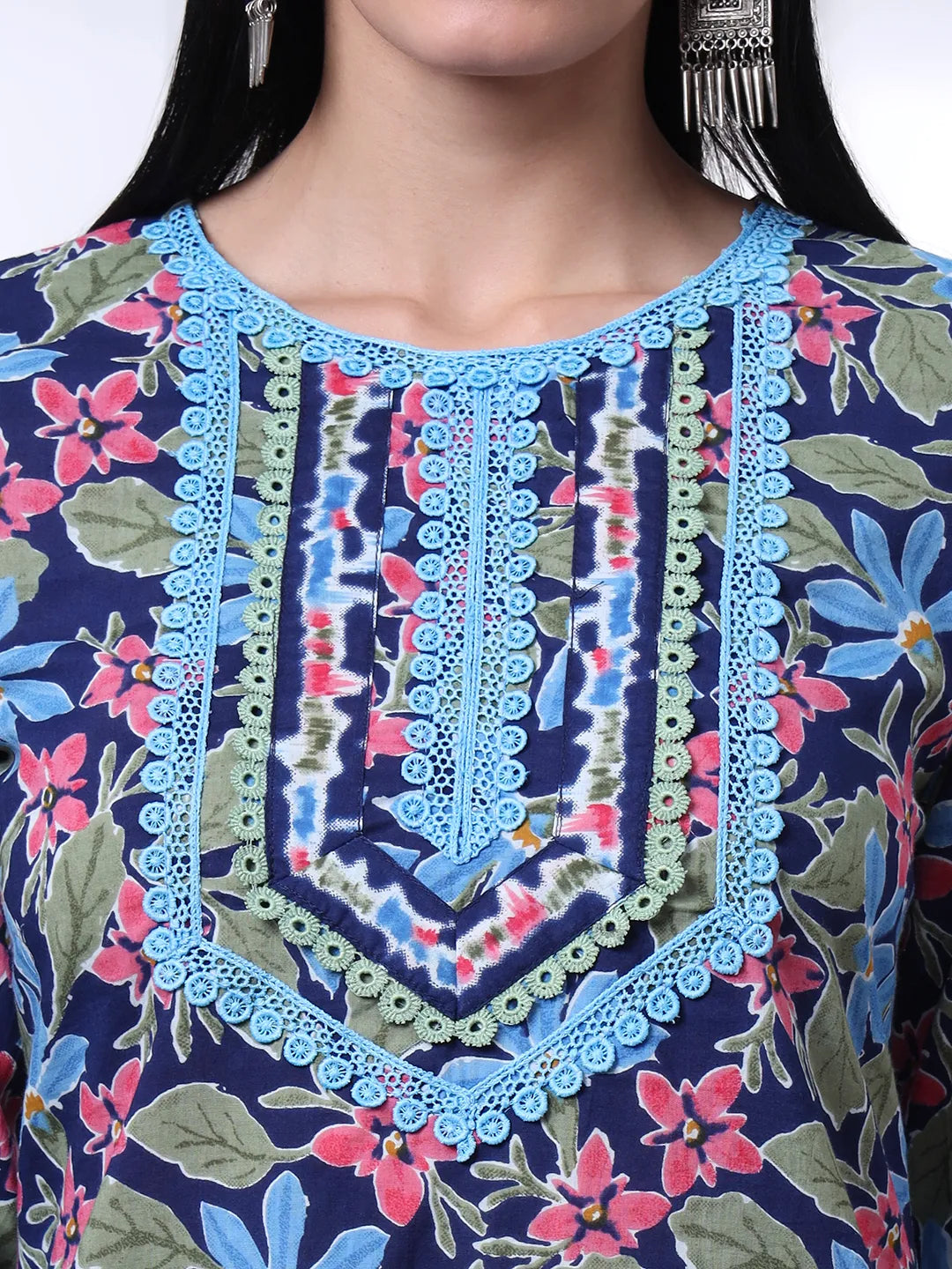 Indigo Blue Lace Work Cotton Straight Kurta Trouser Dupatta Set