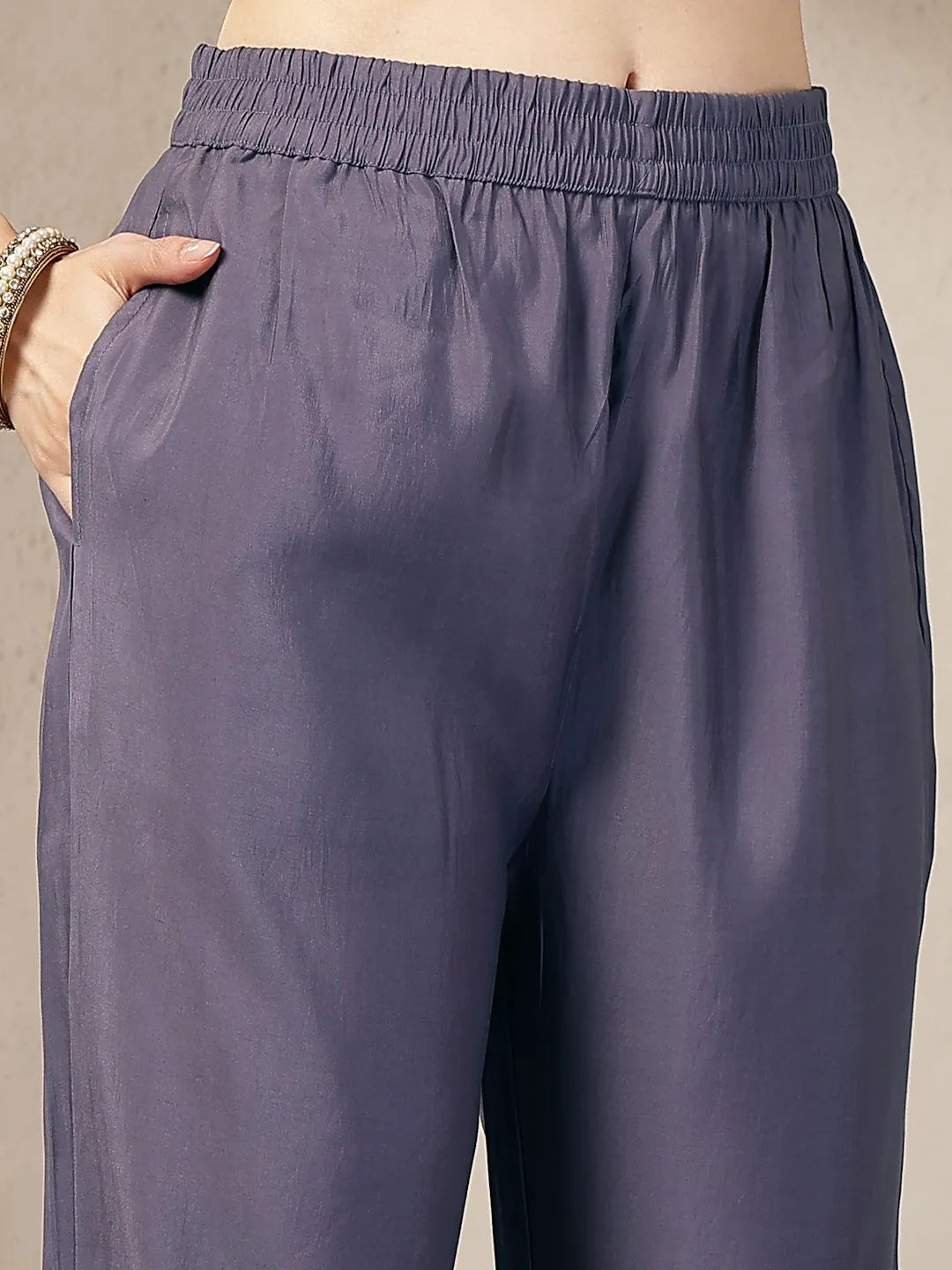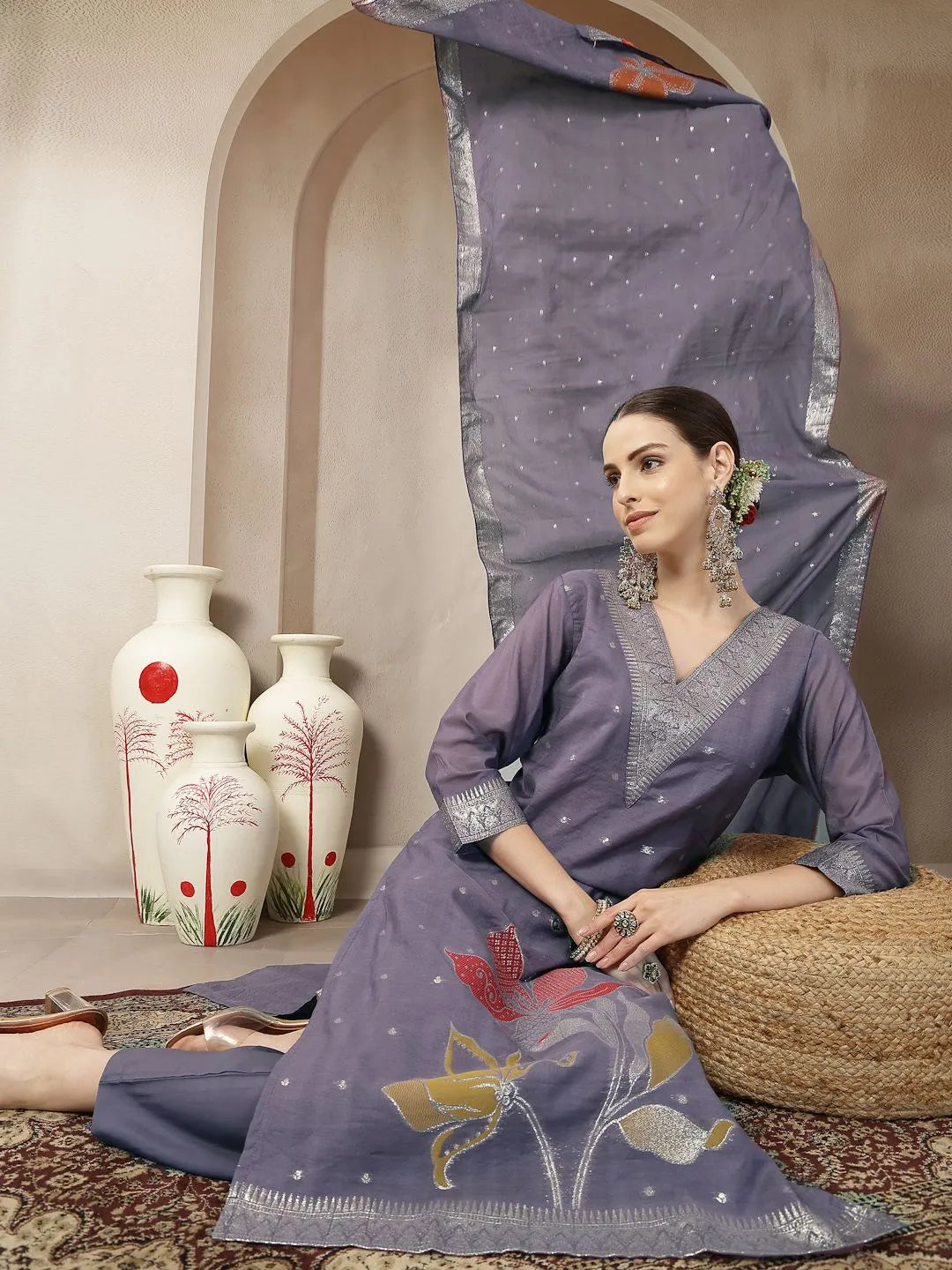 Purple Chanderi Silk Floral Golden Print Straight Kurta Trouser Dupatta Set