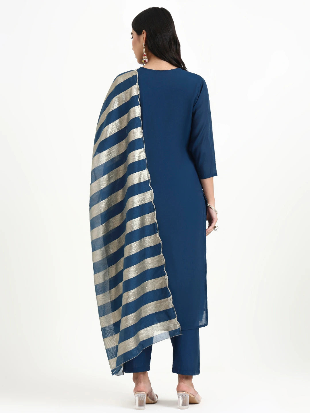 Navy Blue Solid Straight Style Chanderi Silk Lining Kurta Trouser Dupatta Set