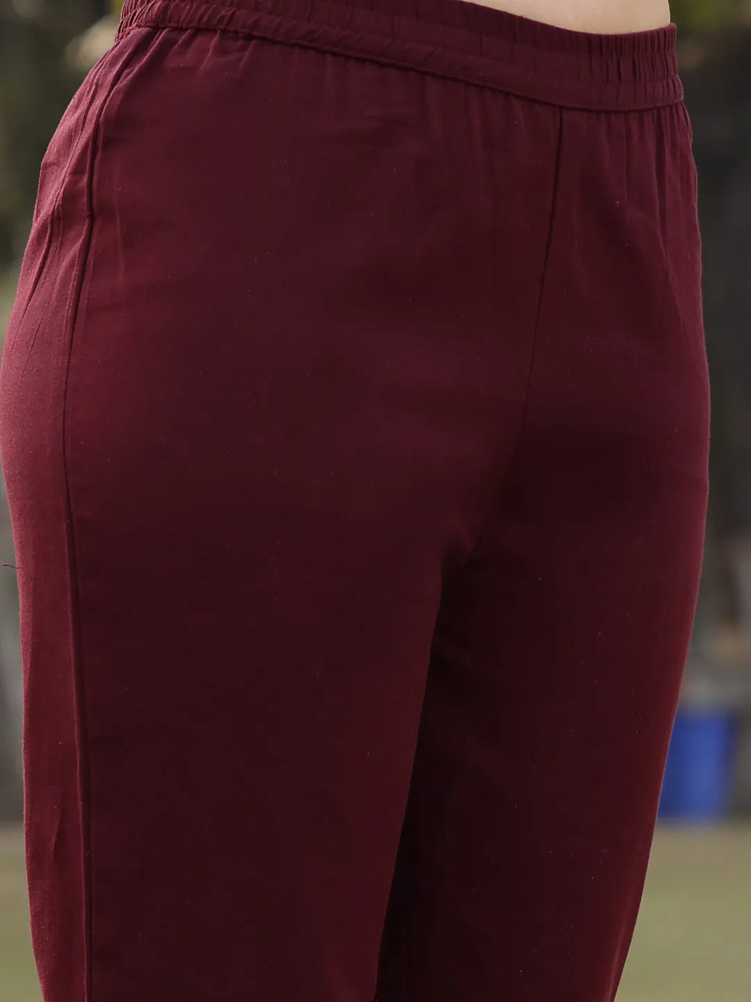 Brown Floral,Sequins_Work Linen Flared Kurta Trouser Dupatta Set