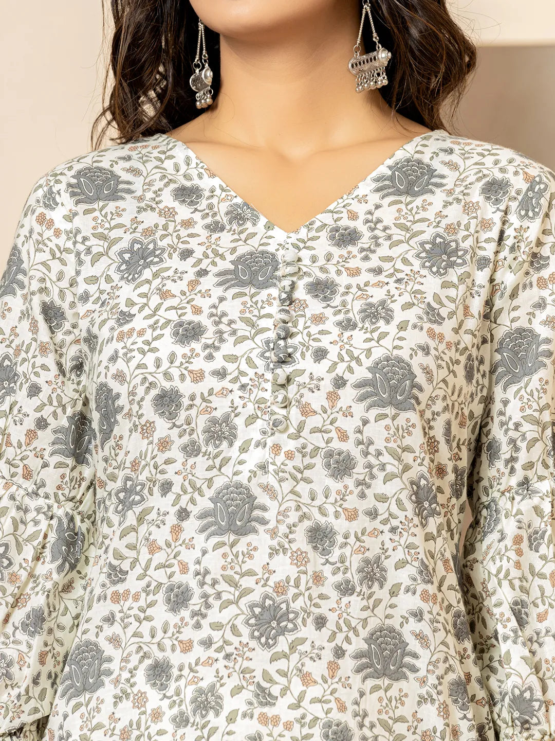 Grey Printed Tunic has V-Neck Three Quarter sleeve full placket and regular waist hem