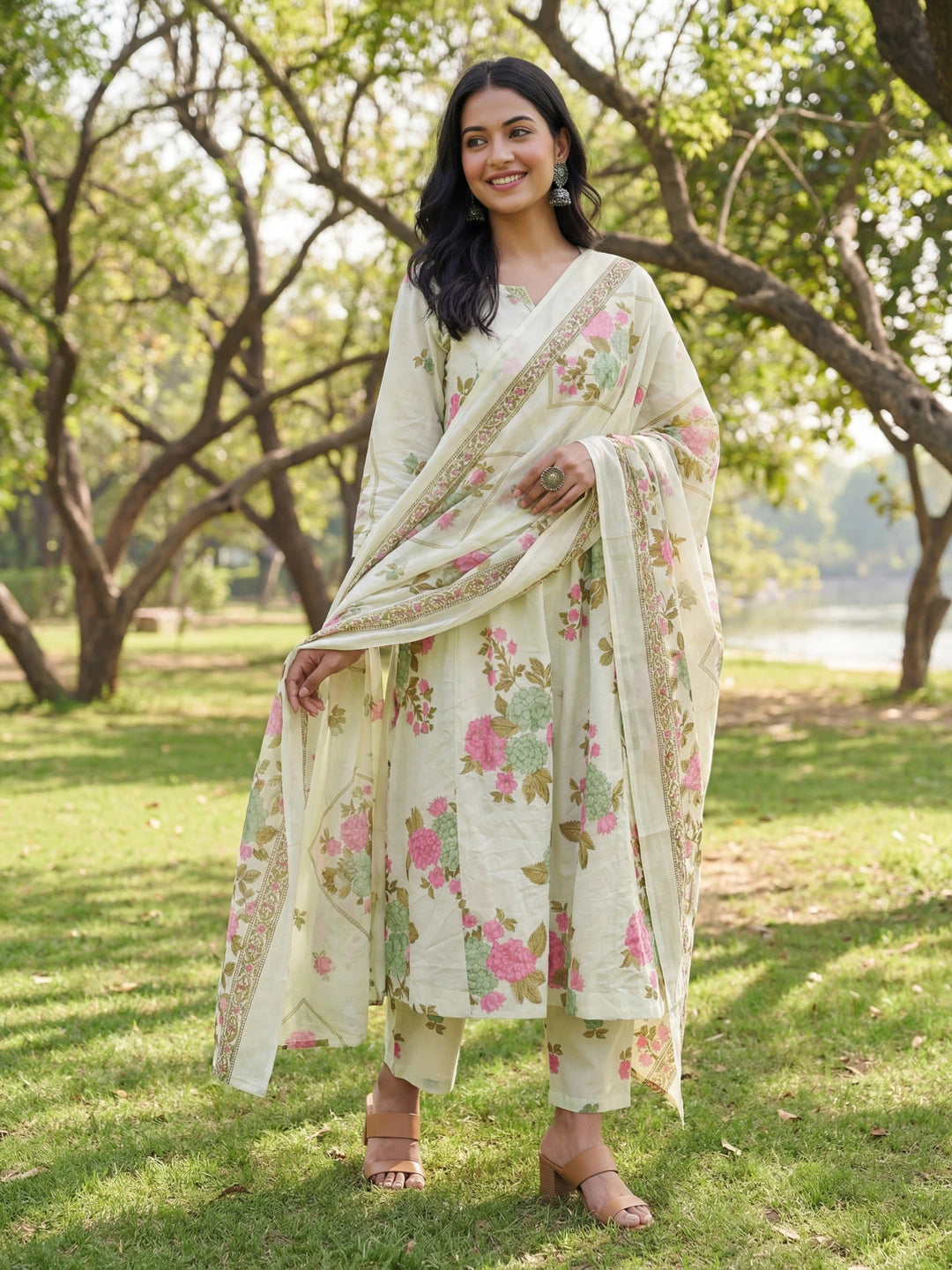 Sea Green Floral Print A-Line Kurta Trouser Dupatta Set