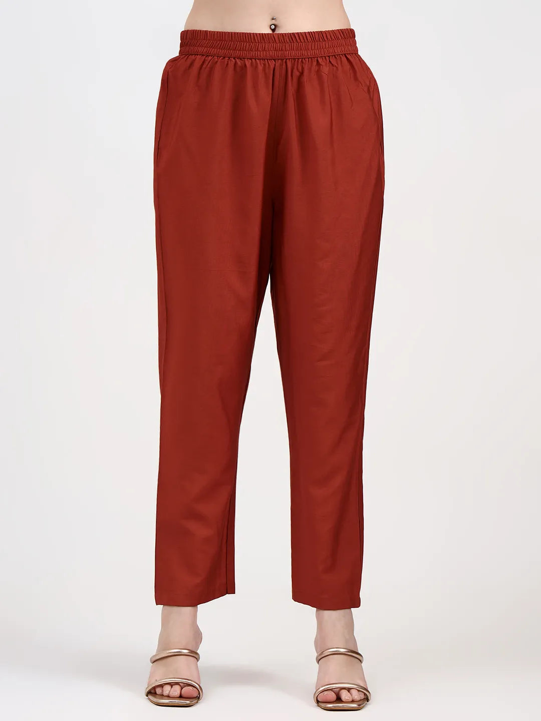 Rust Mul Chanderi Thread Work Sequins Work A-Line Kurta Trouser Dupatta Set
