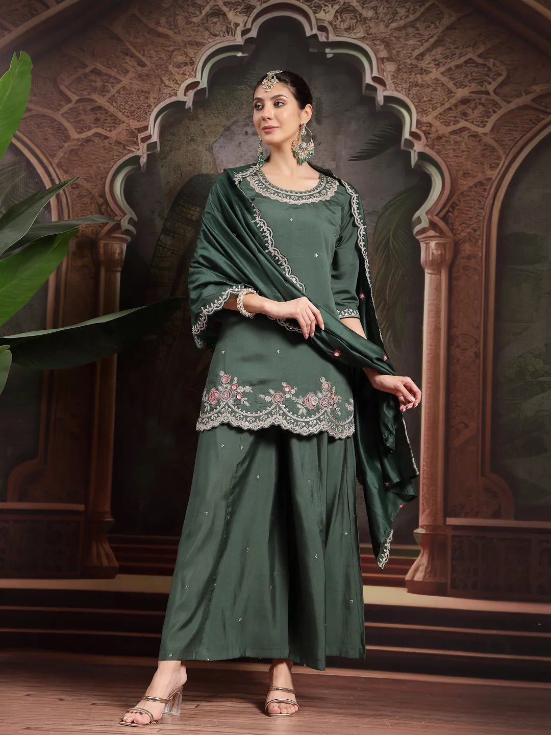 Green Silk Blend Embroidered Straight Kurta Dupatta Palazzo Set