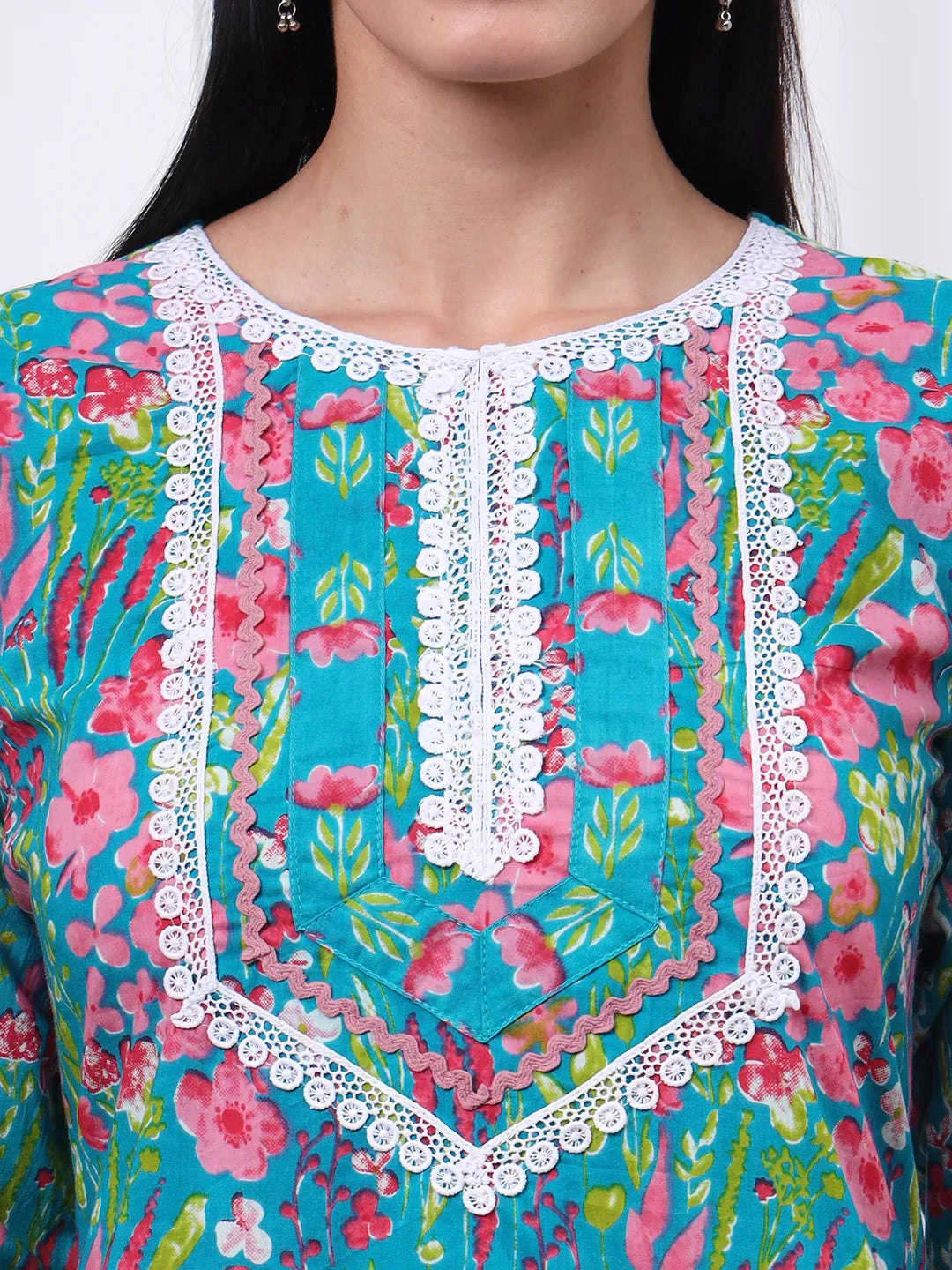 Turquoise Blue Patch Work Lace Work Cotton Straight Kurta Trouser Dupatta Set