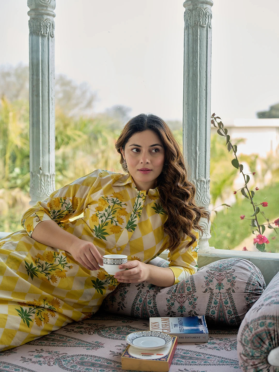 Yellow Floral And Geometric Straight Button Yoke Kurta Trouser Set