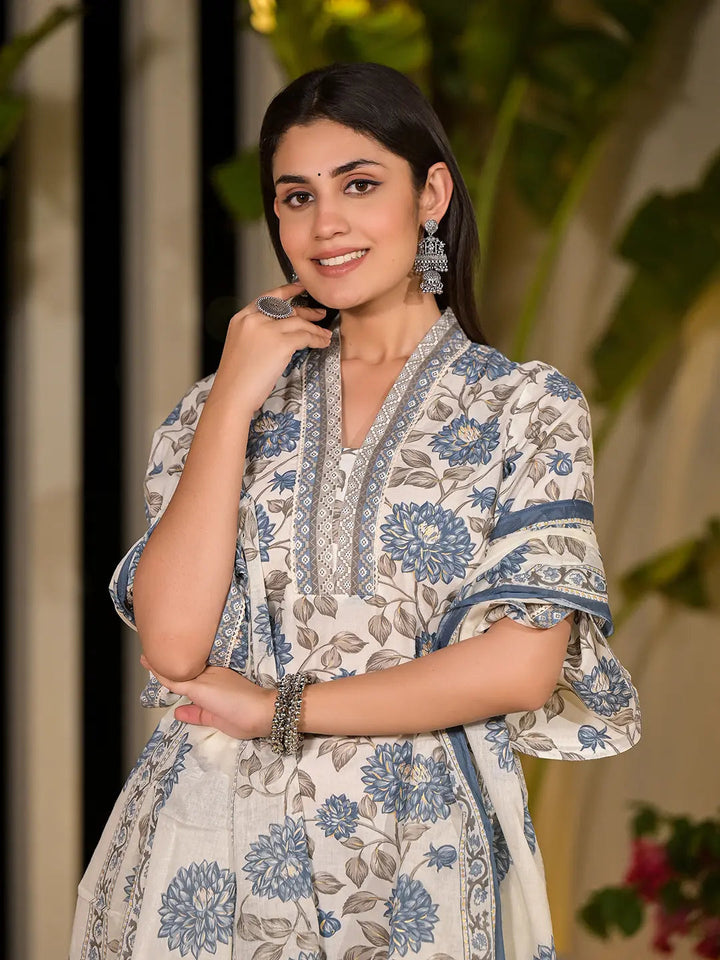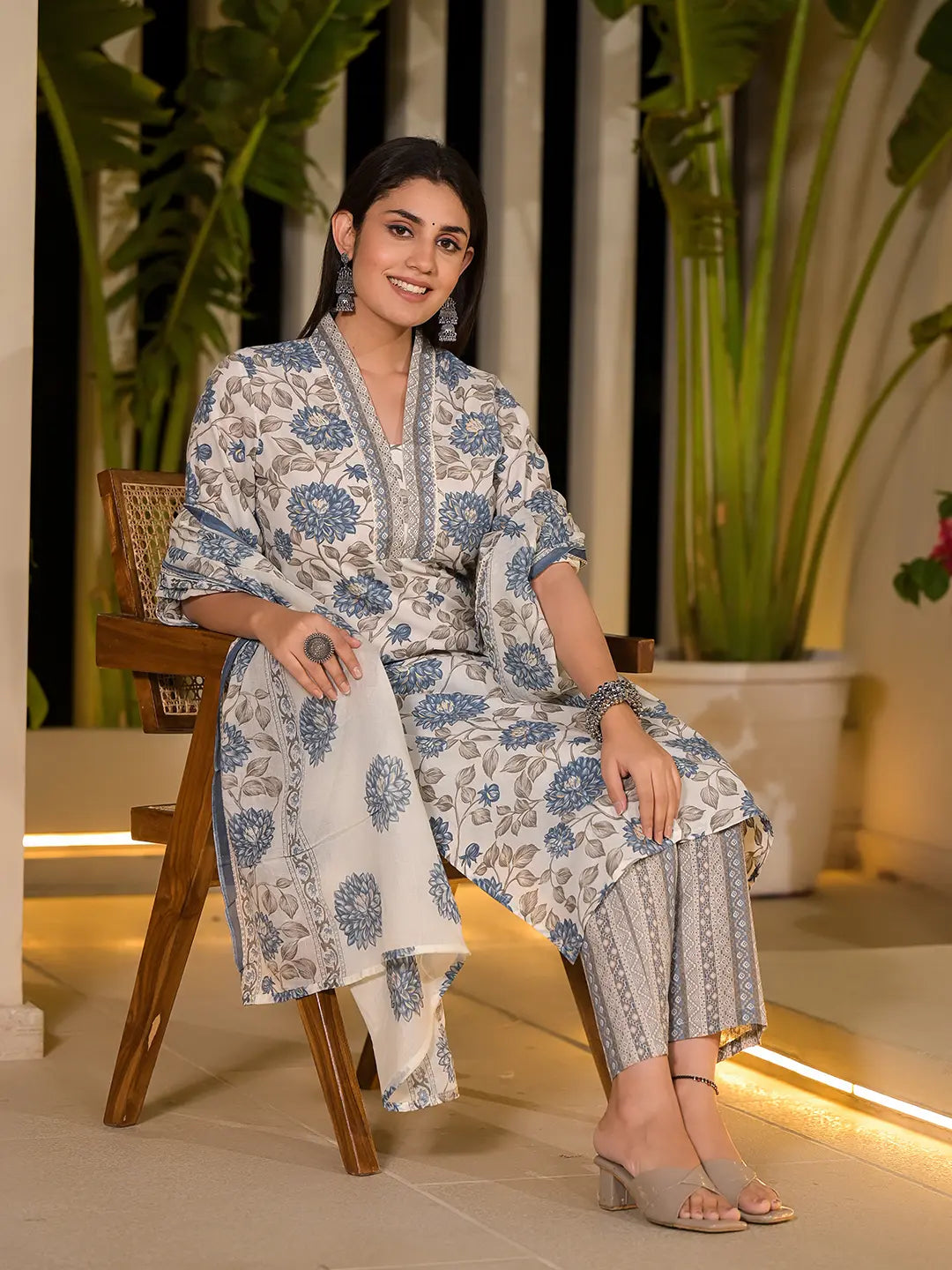Blue And Off White Floral Print Cotton Straight Style Kurta And Trousers With Dupatta