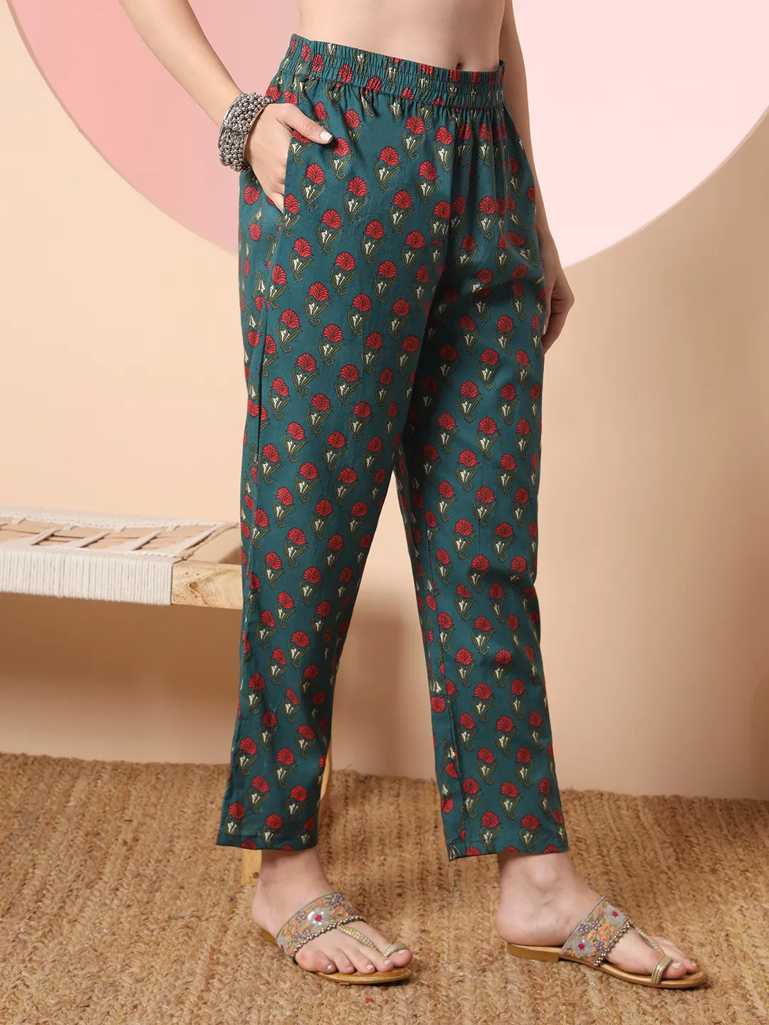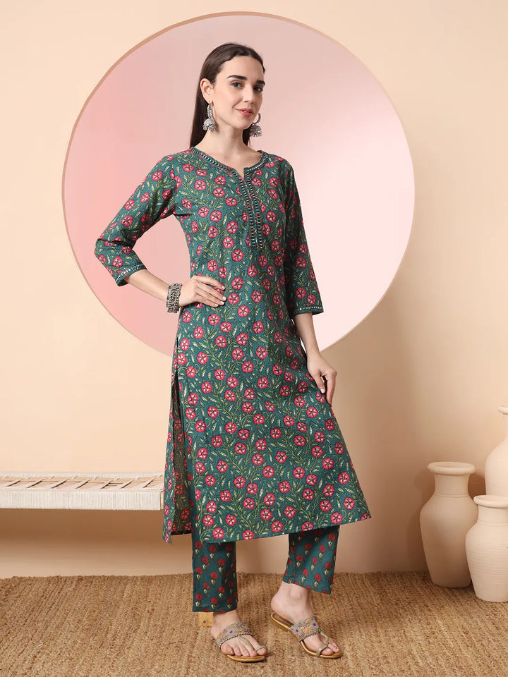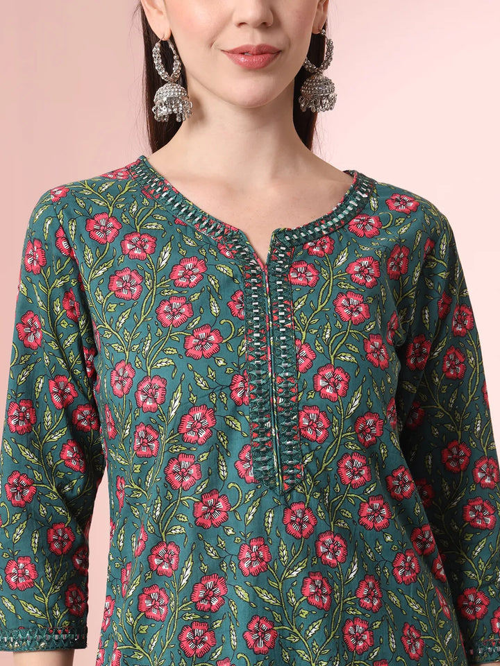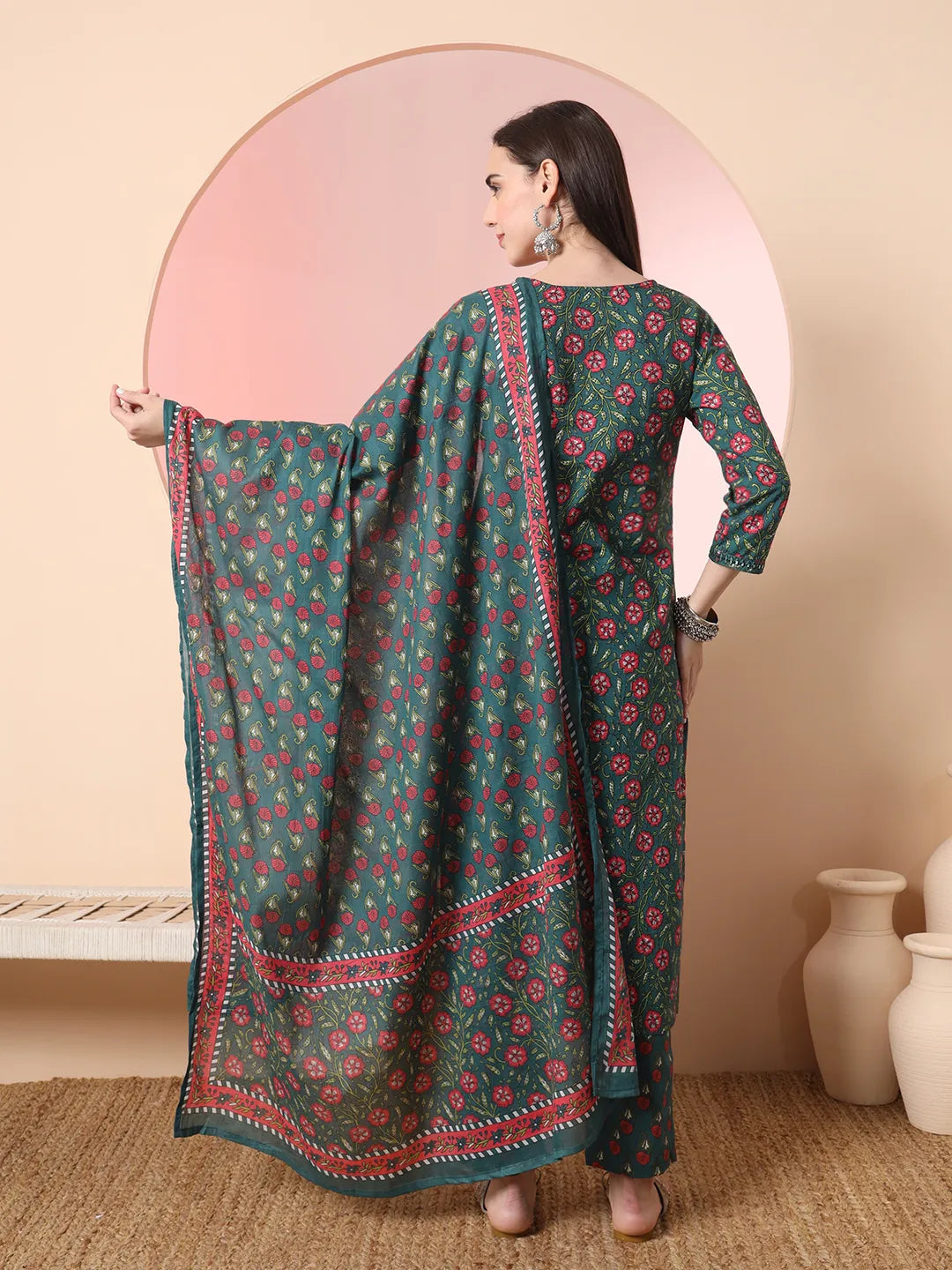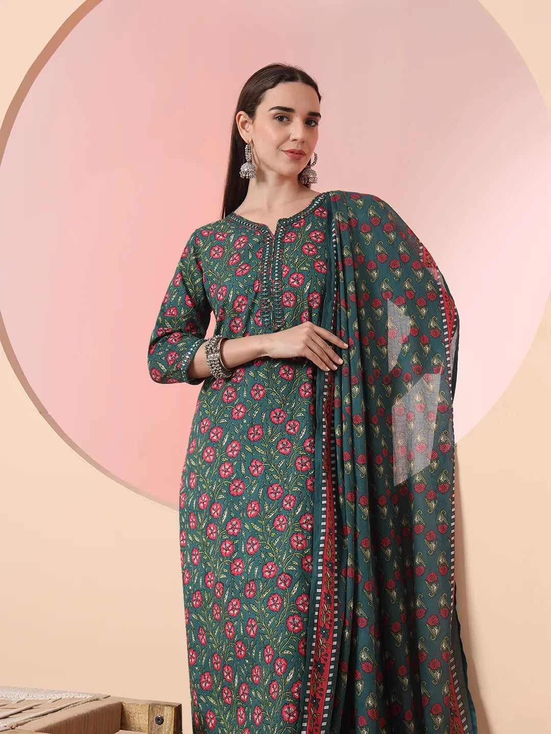 Green Floral Embroidered Kurta with Trousers with dupatta Set