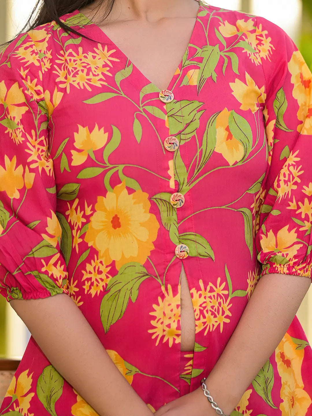 Pink printed tunic, has a V-neck and three-quarter sleeves