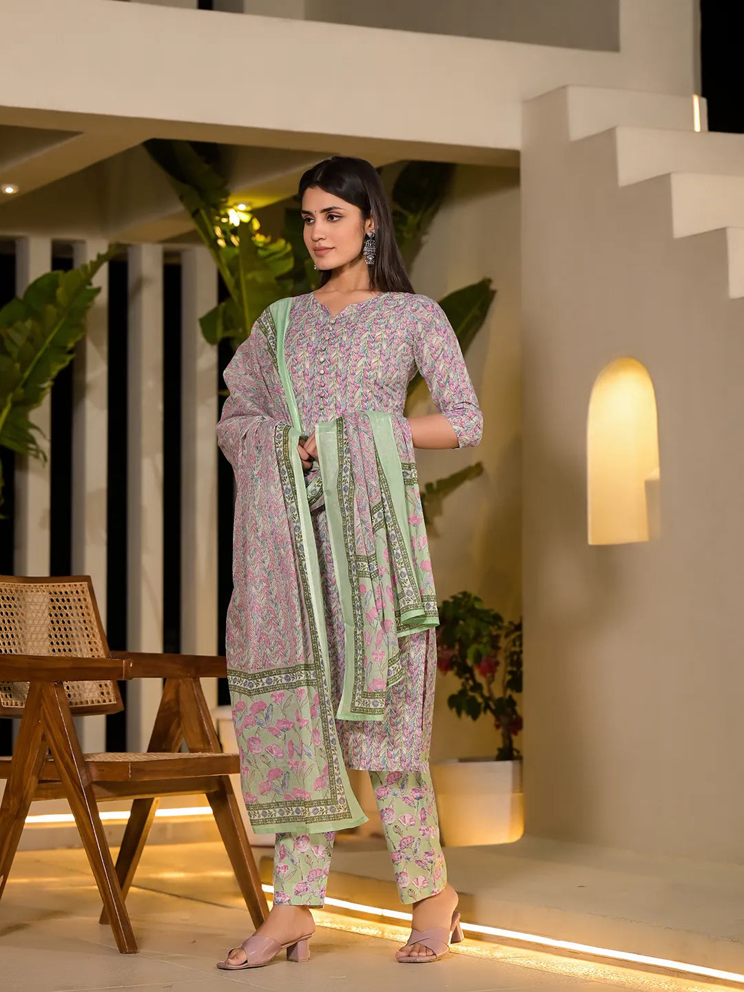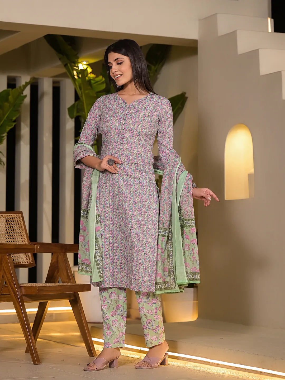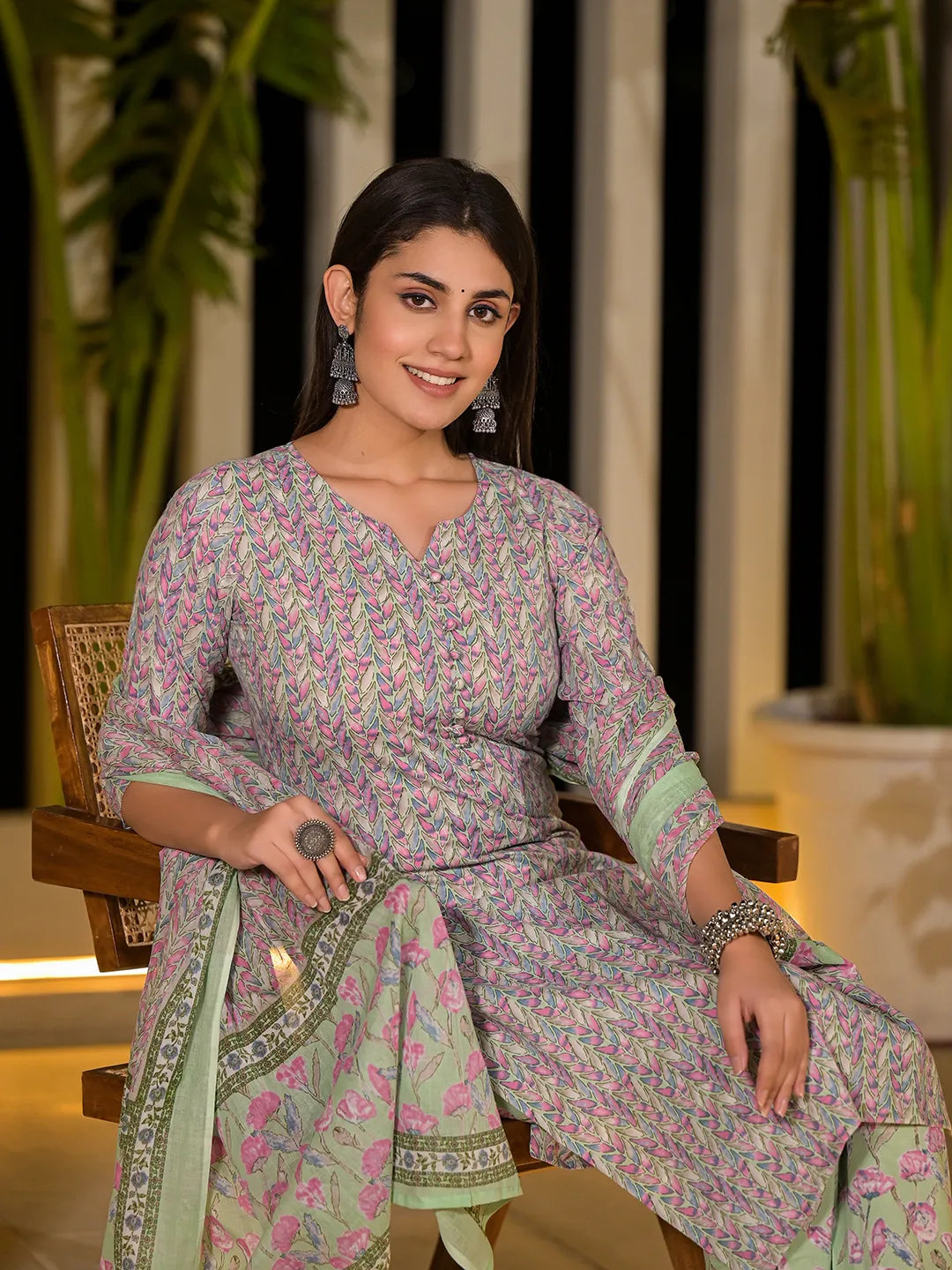 Sea Green Leaf Print Cotton Straight Style Kurta And Trousers With Dupatta