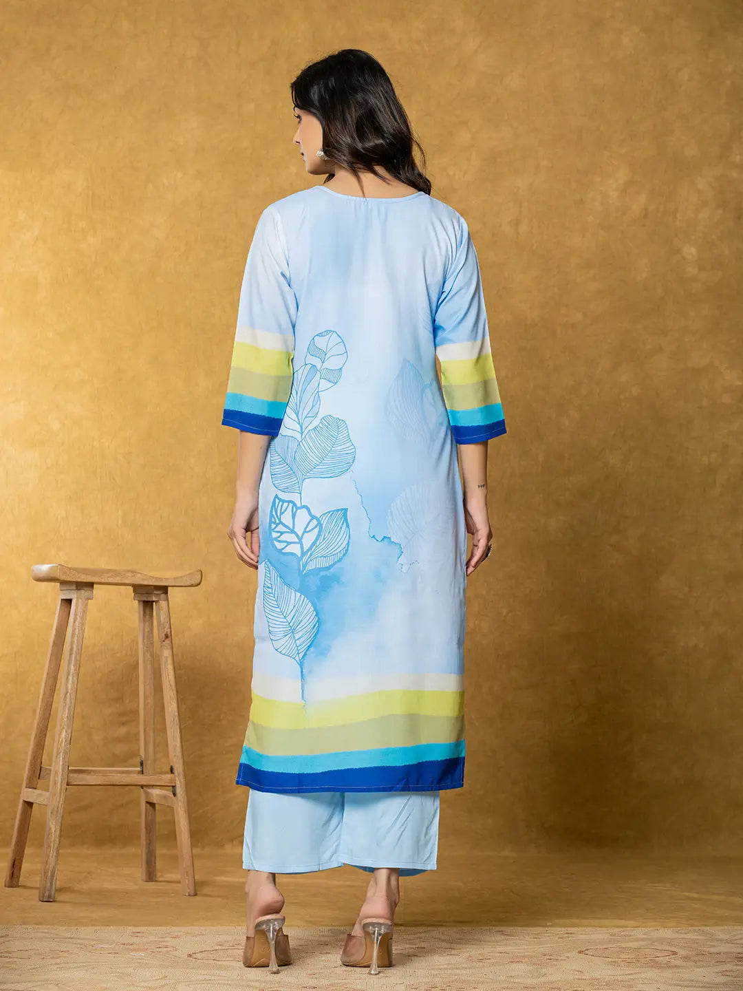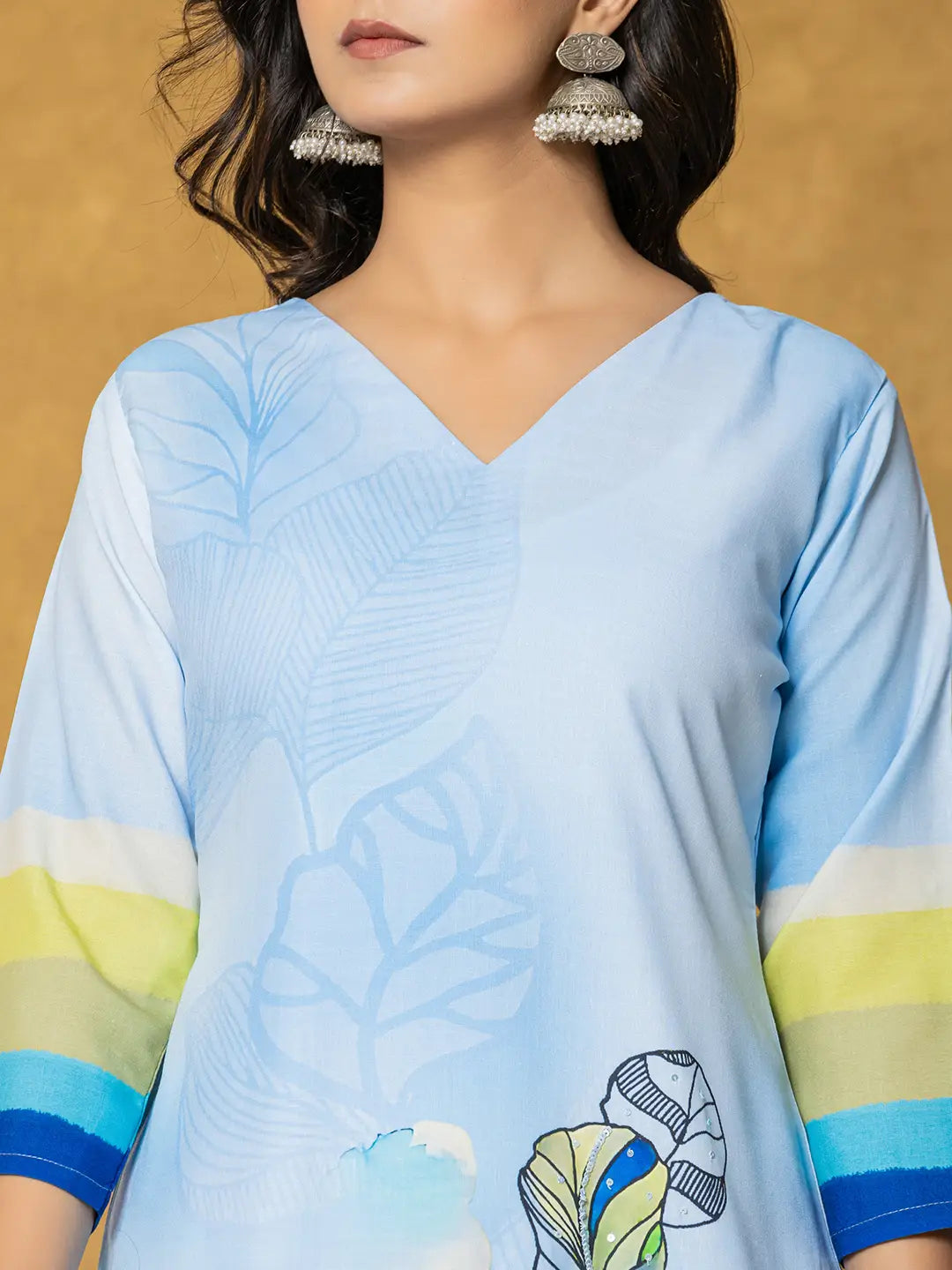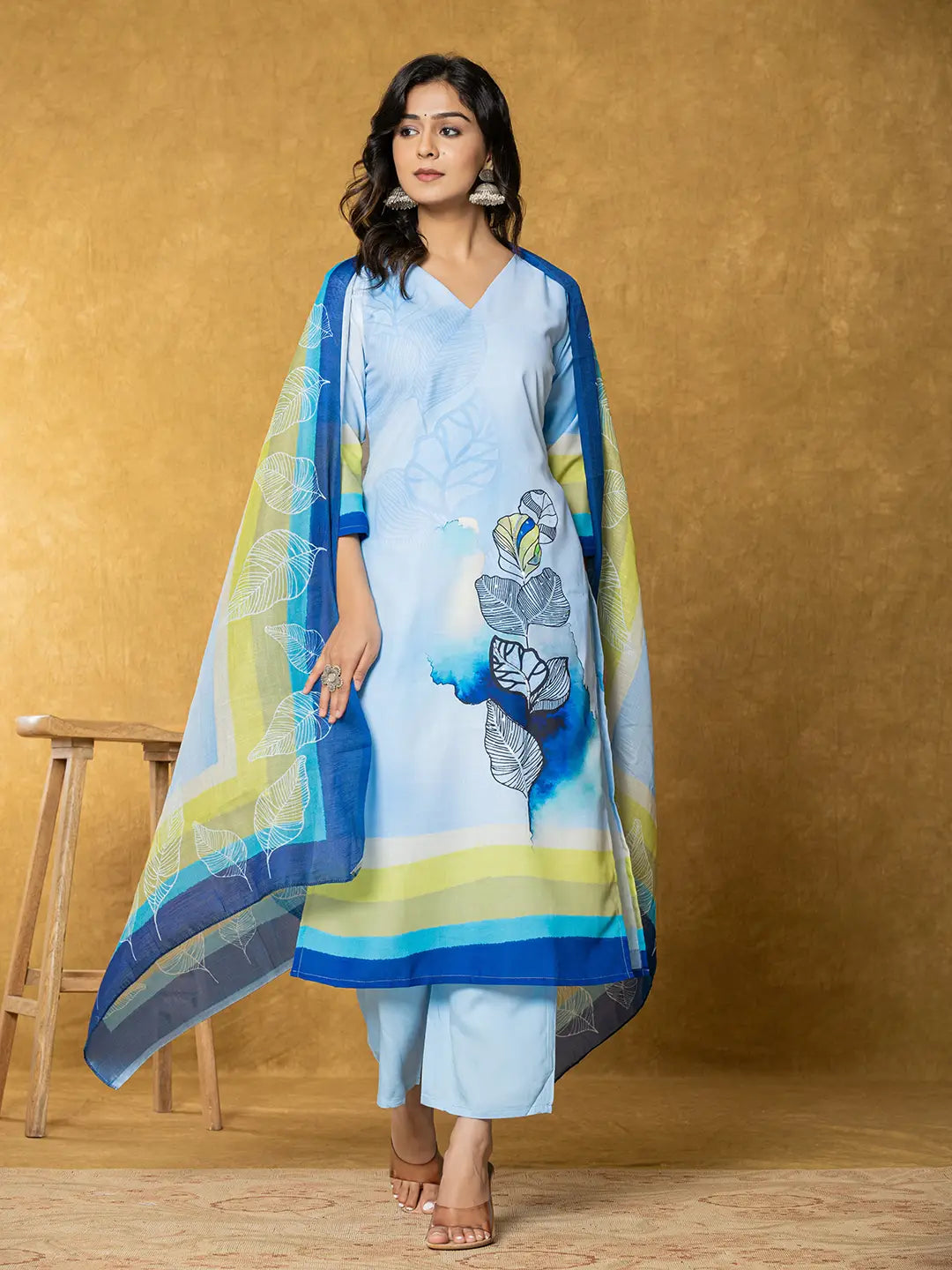Sky Blue Linen Floral Kurta Dupatta Pant Set-Yufta Store-7320SKDSBS