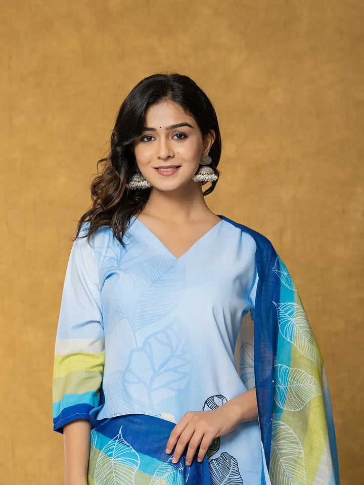 Sky Blue Linen Floral Kurta Dupatta Pant Set
