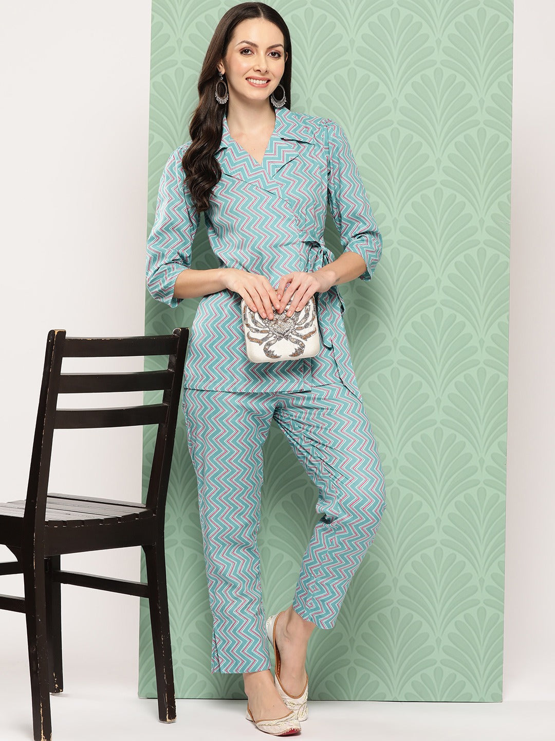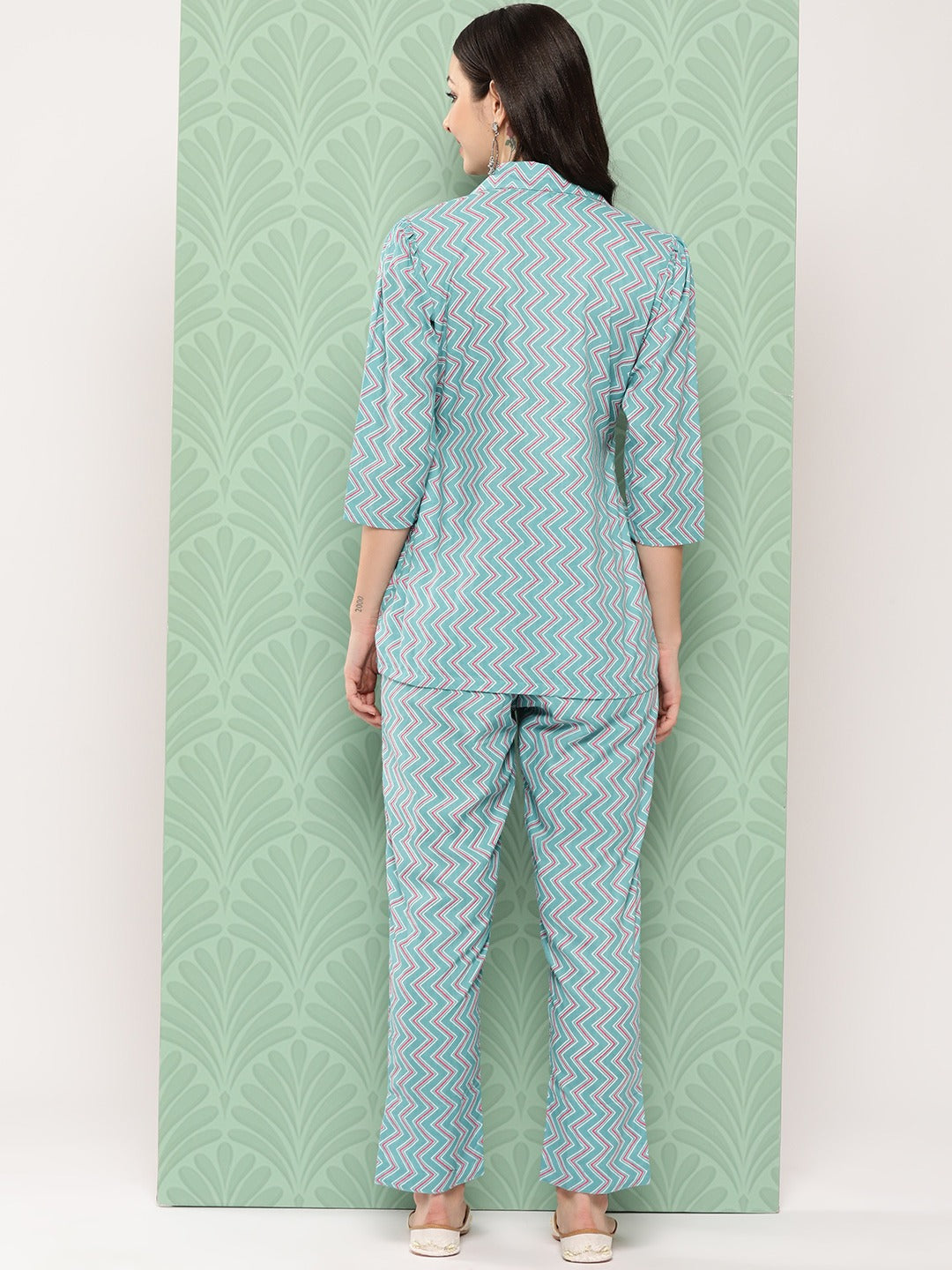 Teal Blue Printed Pure Cotton Top with Trousers-Yufta Store-1464CRDTBS