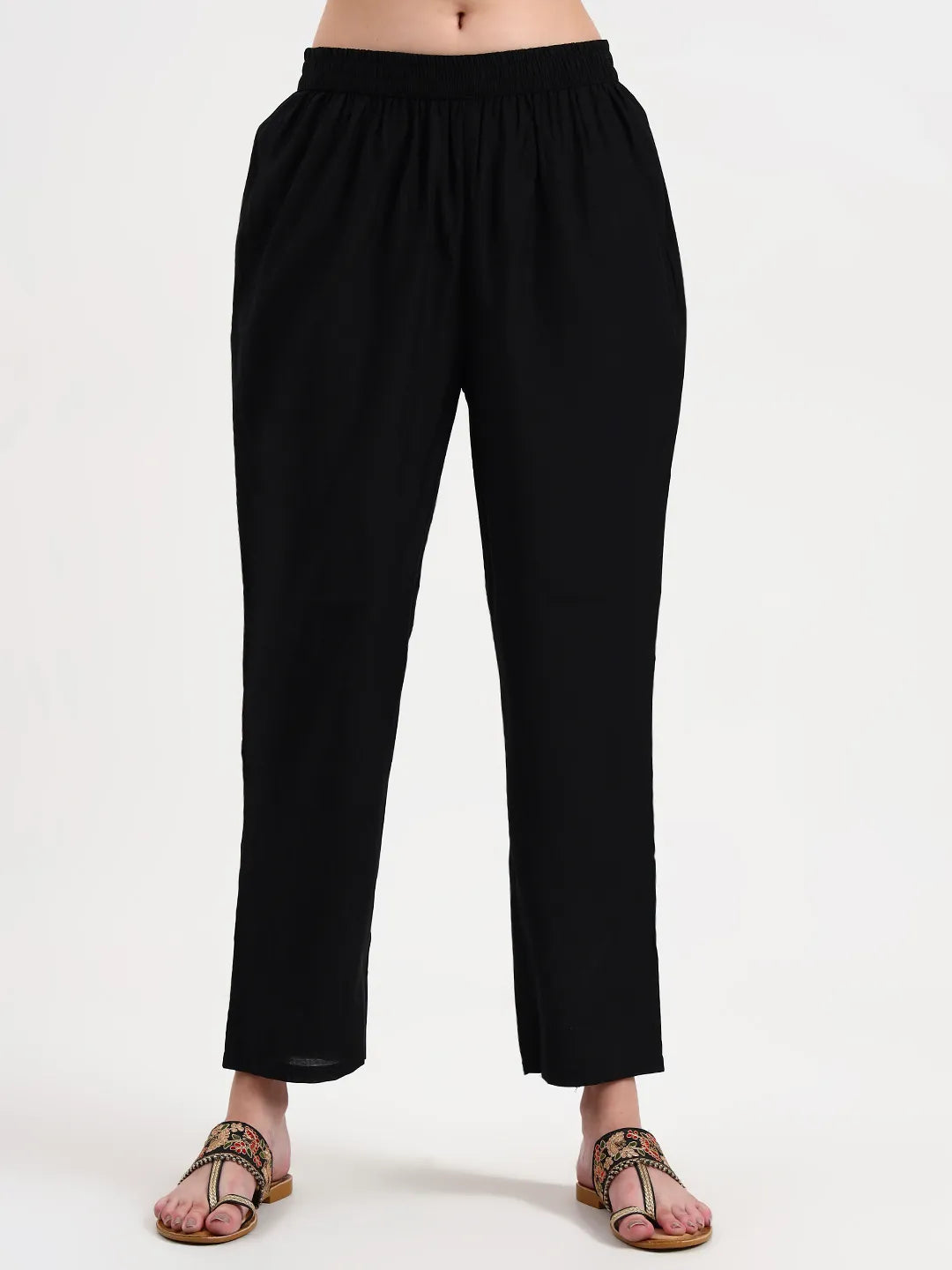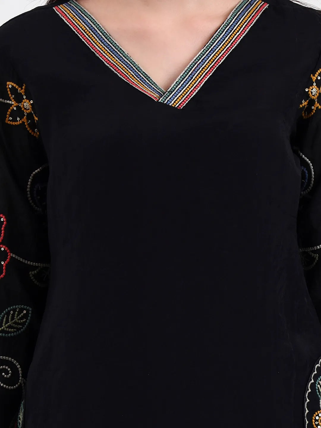 Black Kantha Work Chanderi Silk A-Line Kurta Trouser Dupatta Set