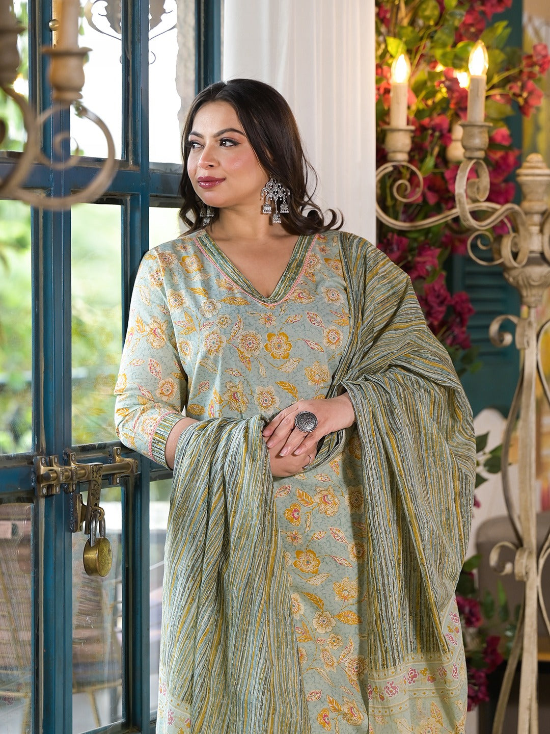 Sea Green Floral Print Straight Plus size Kurta Harem pants And Dupatta Set