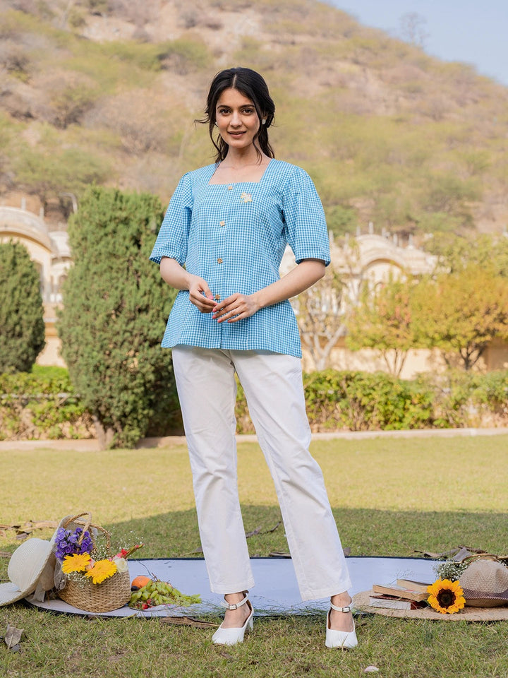 The sky blue cotton checks printed top by Yufta is the epitome of chic and comfort. This top is crafted to perfection, ensuring a flawless fit and exquisite style. Perfect for casual outings or special events, this women top design adds a touch of sophistication to your ensemble. Made from high-quality fabric, it's a wardrobe essential. Get yours from Yufta today!