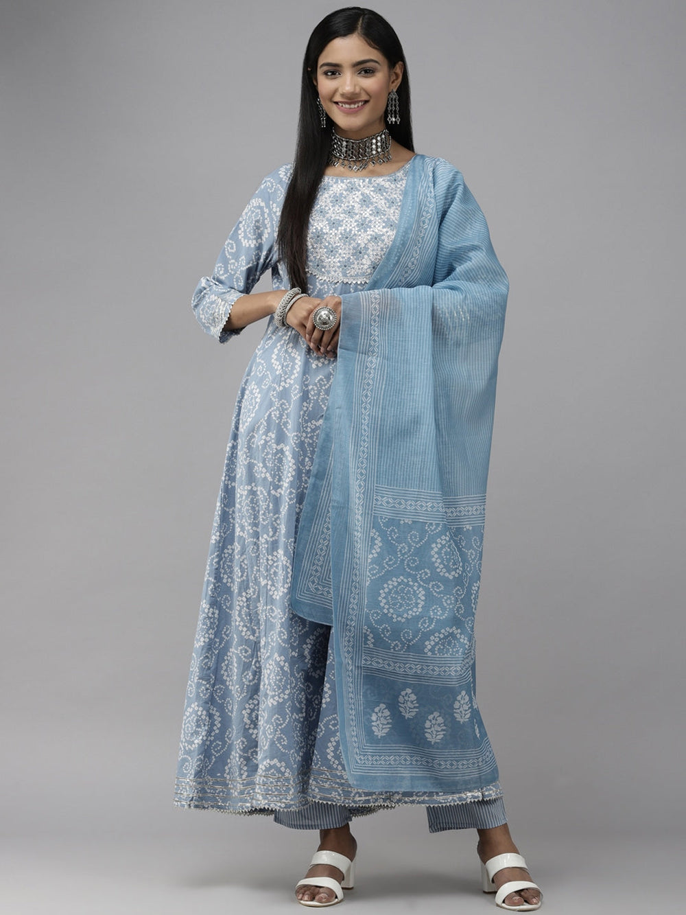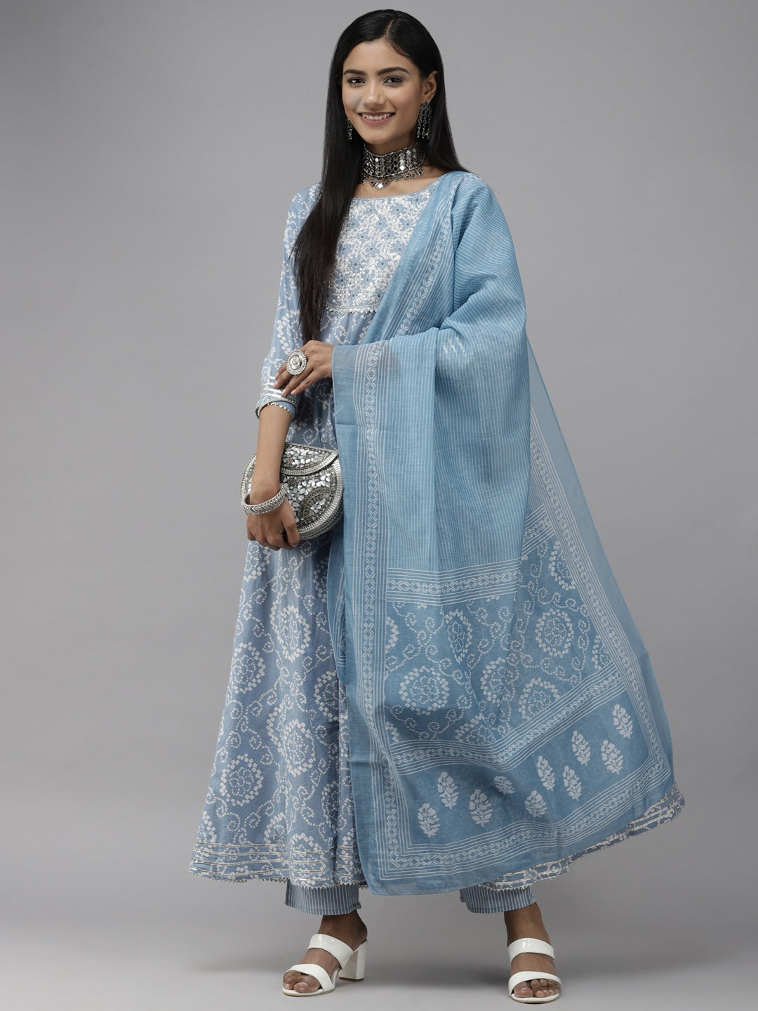 Navy Blue Floral Print Cotton Fit And Flare Kurta Trouser & Dupatta Set