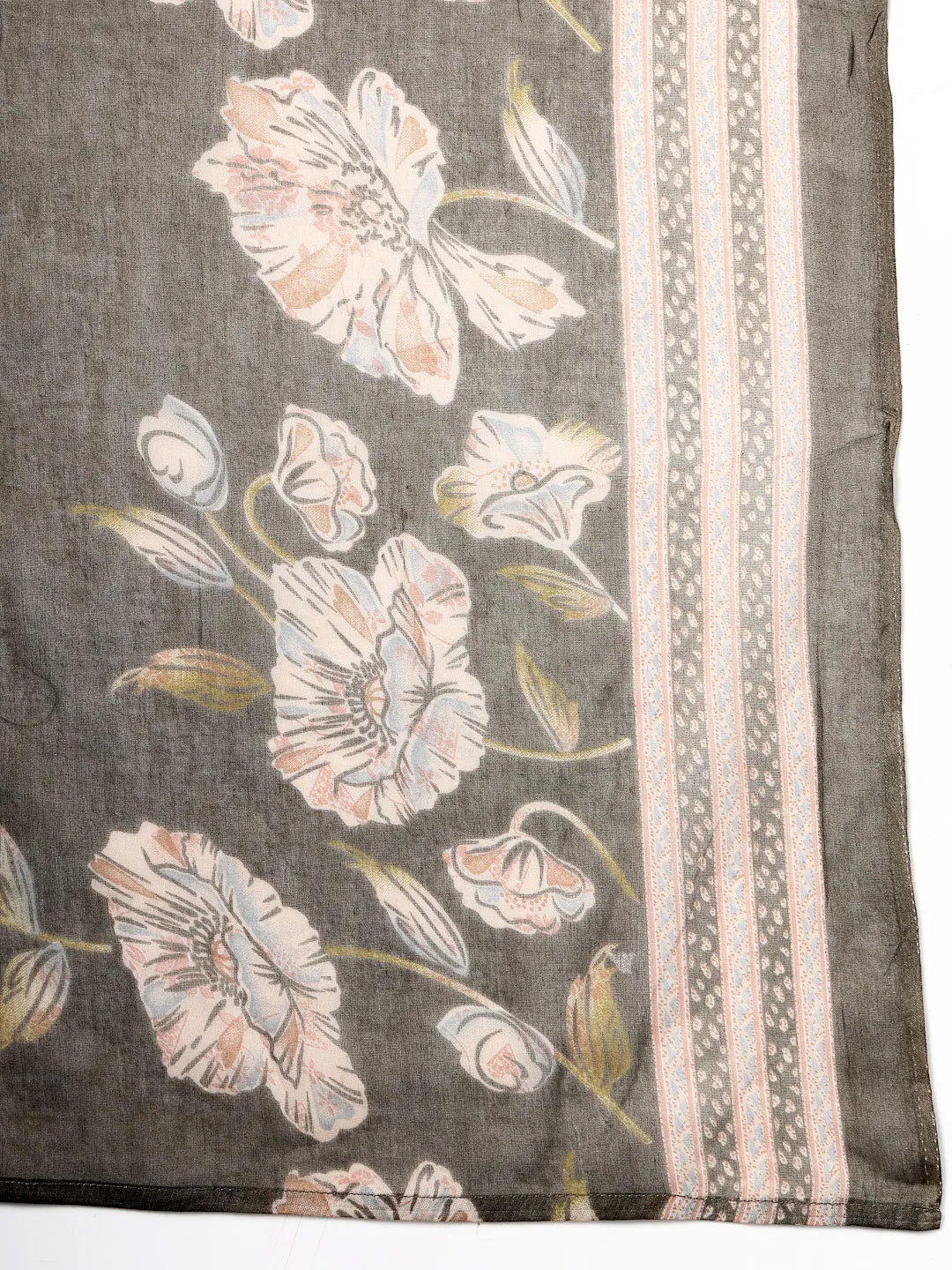 Olive Floral Print Anarkali Silk Blend Kalidaar Kurta Trouser Dupatta Set