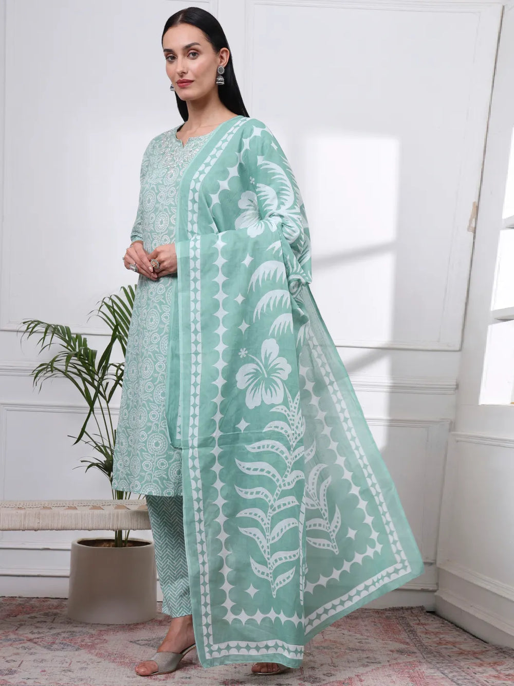 Sea Green Pure Cotton Floral Sequins-Work Straight Kurta Trouser Dupatta Set