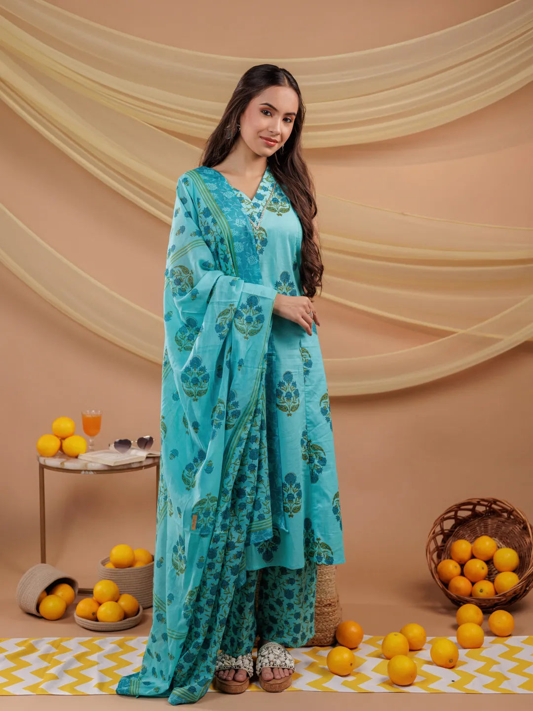 Stay cool and stylish with this Blue Floral Print Cotton A-Line Kurta Dupatta Set. The breathable cotton fabric and vibrant floral design make it a must-have for casual events and festive gatherings. Elevate your ethnic style with this stunning ensemble.