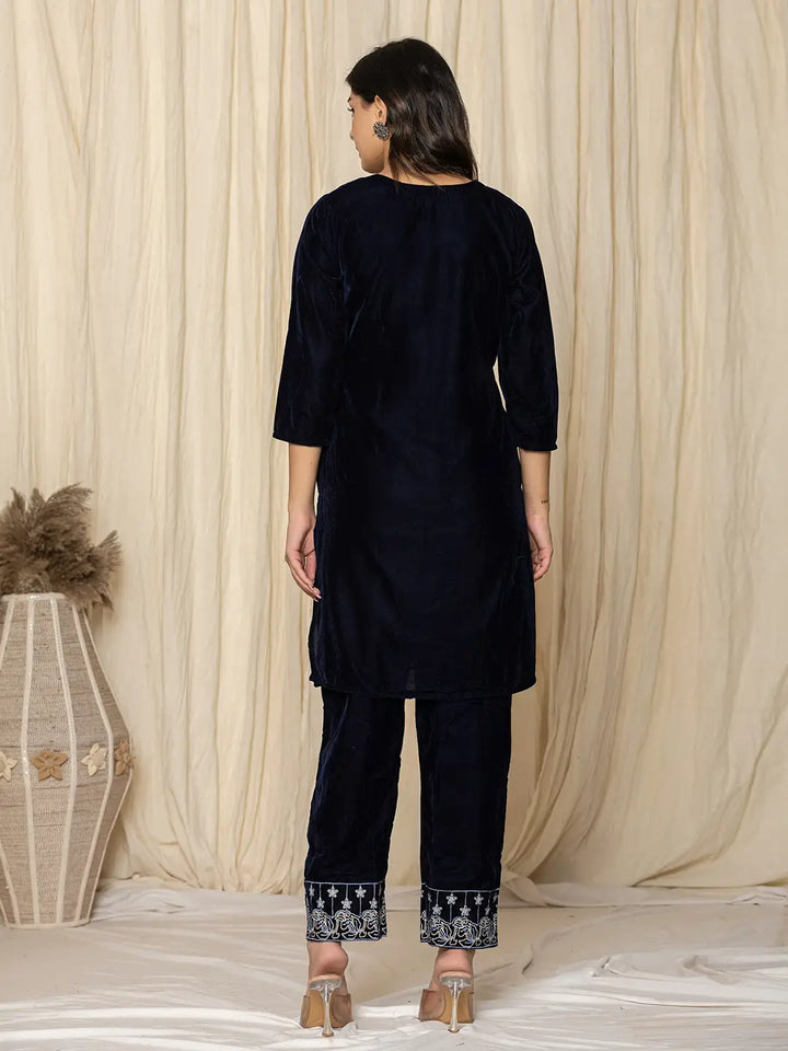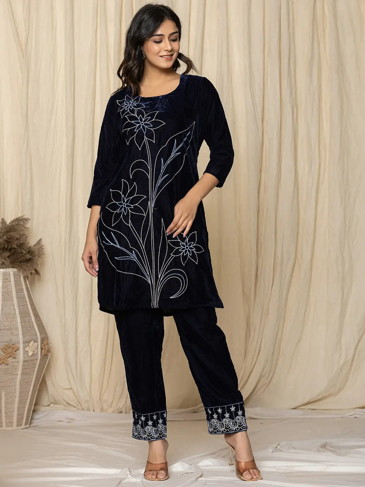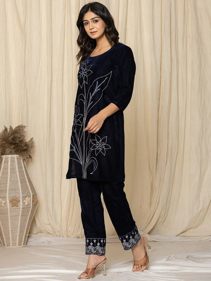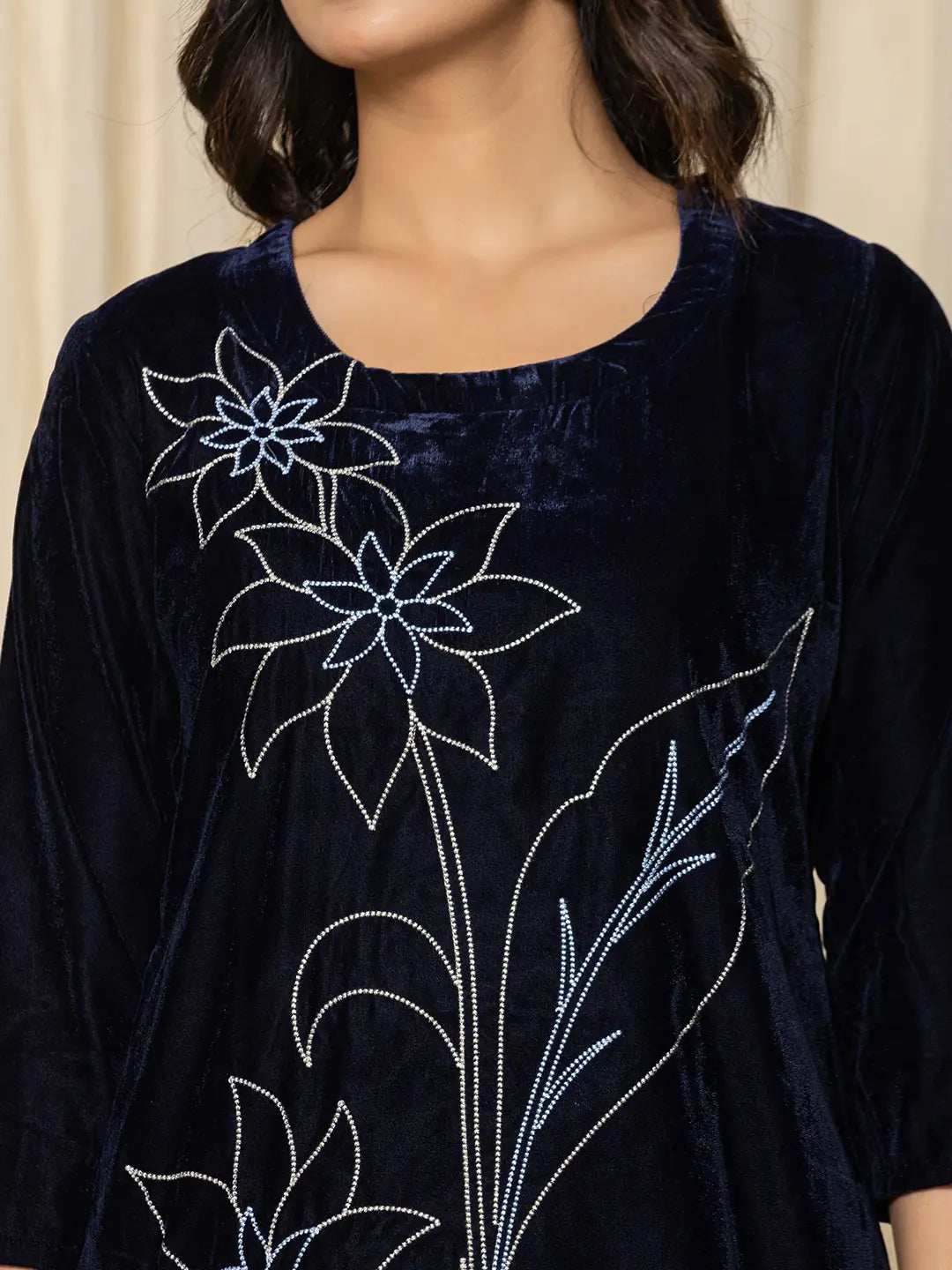Blue embroidered tunic, has a round-neck, three-quarter sleeves and side slits