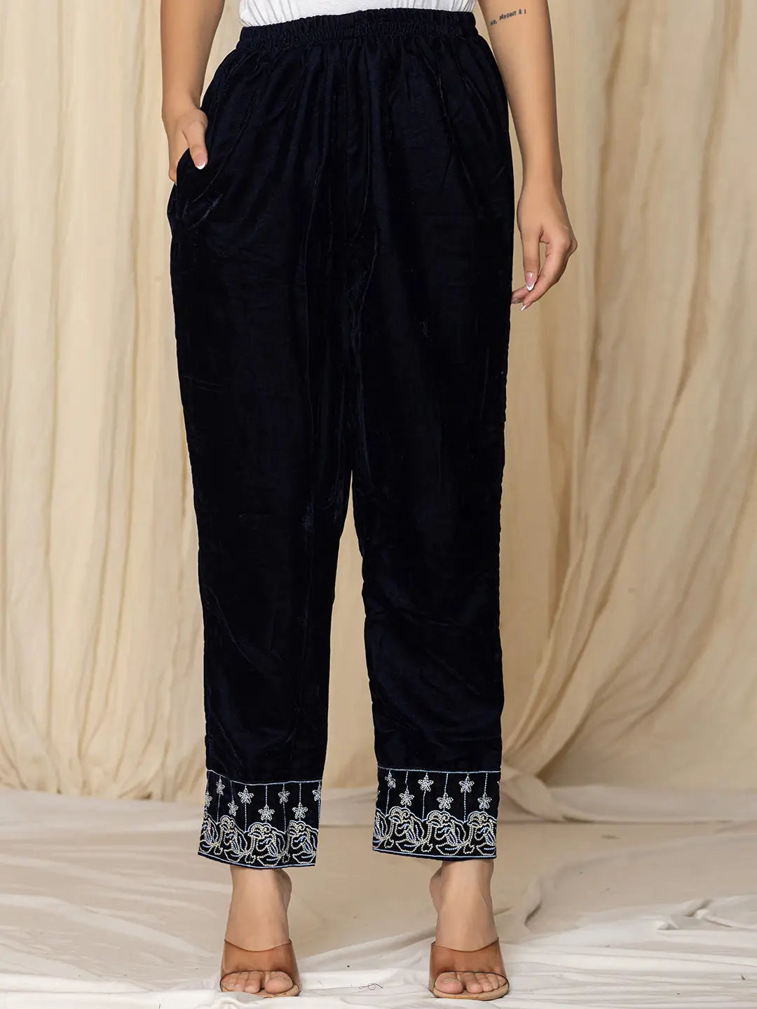 Blue embroidered trouser, has an elasticated waistband with a slip-on closure