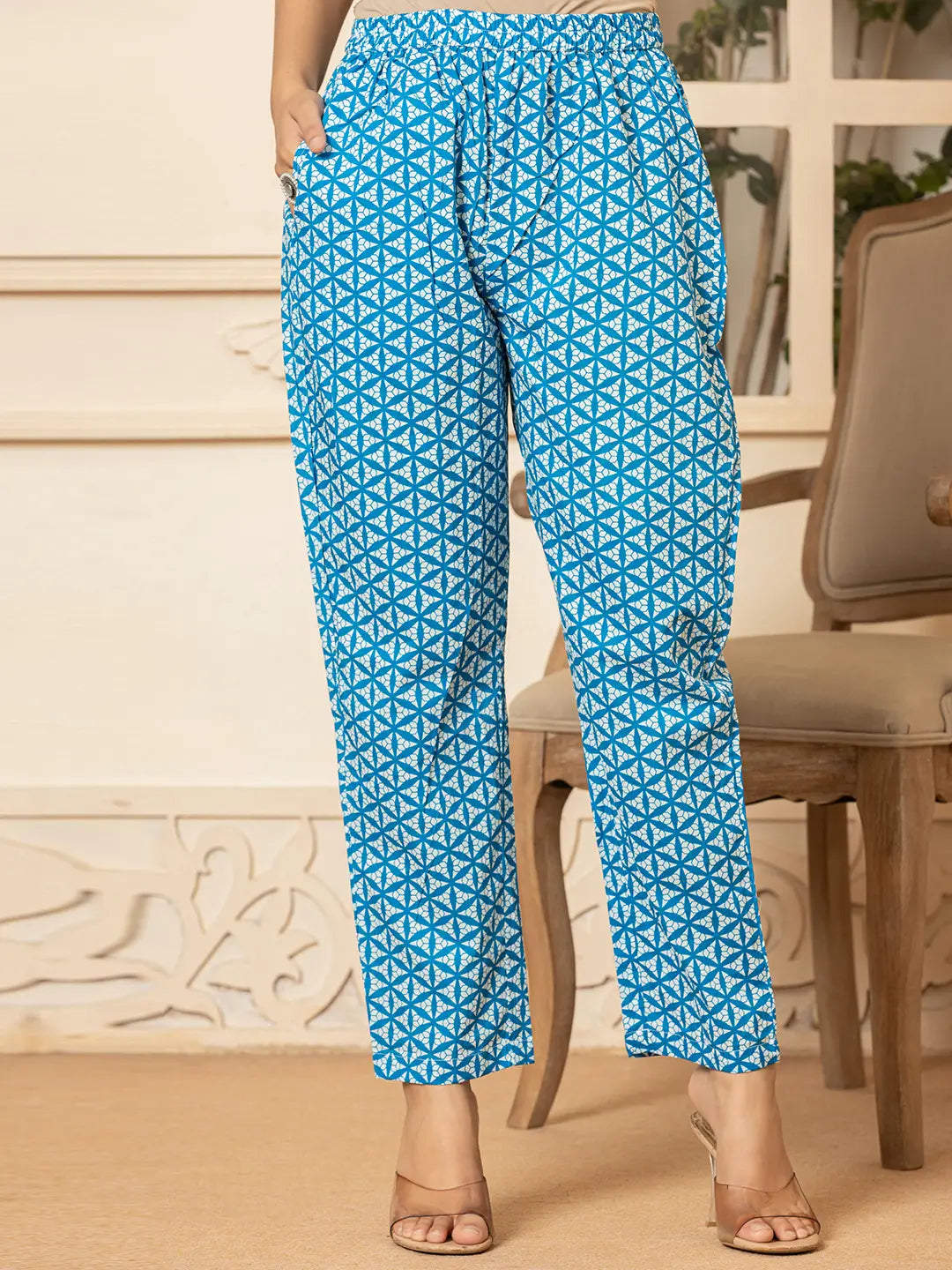 Blue Floral Print Embroidery Pure cotton Straight Kurta And Trouser with dupatta Set