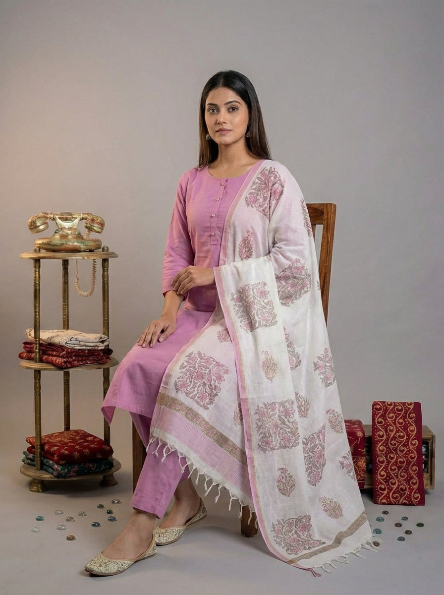 Step into easy summer elegance with this mouve straight-fit viscose-silk kurta, paired with a handcrafted hand-block printed dupatta. Soft, flowy, and refined — perfect for daily wear, office, and festive occasions.