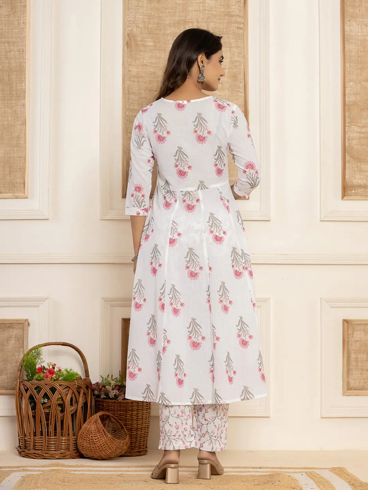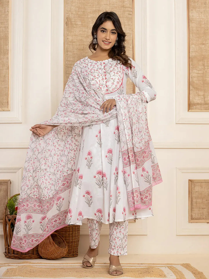 Pink And White Floral Print Piping Anarkali Style Kurta And Trousers With Dupatta Set-Yufta Store-7015SKDPKS