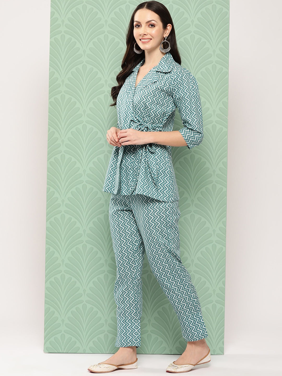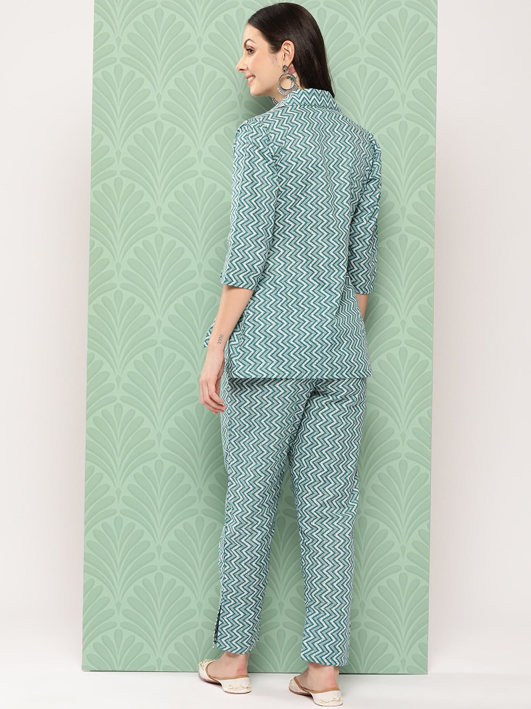 Step out in style with the fashionable teal green printed pure cotton top with trousers. This must-have co-ords is crafted for those who love to make a bold statement. The coord set party wear co-ord set showcases a unique design and high-quality fabric, ensuring you stand out in any crowd. Perfect for both casual and formal occasions, it's the ultimate addition to your wardrobe.