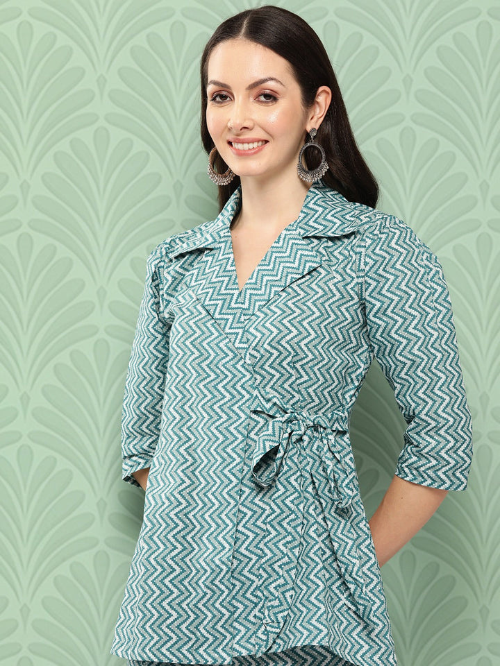 Teal printed wrap Top, has a shirt collar neck, three-quarter sleeves