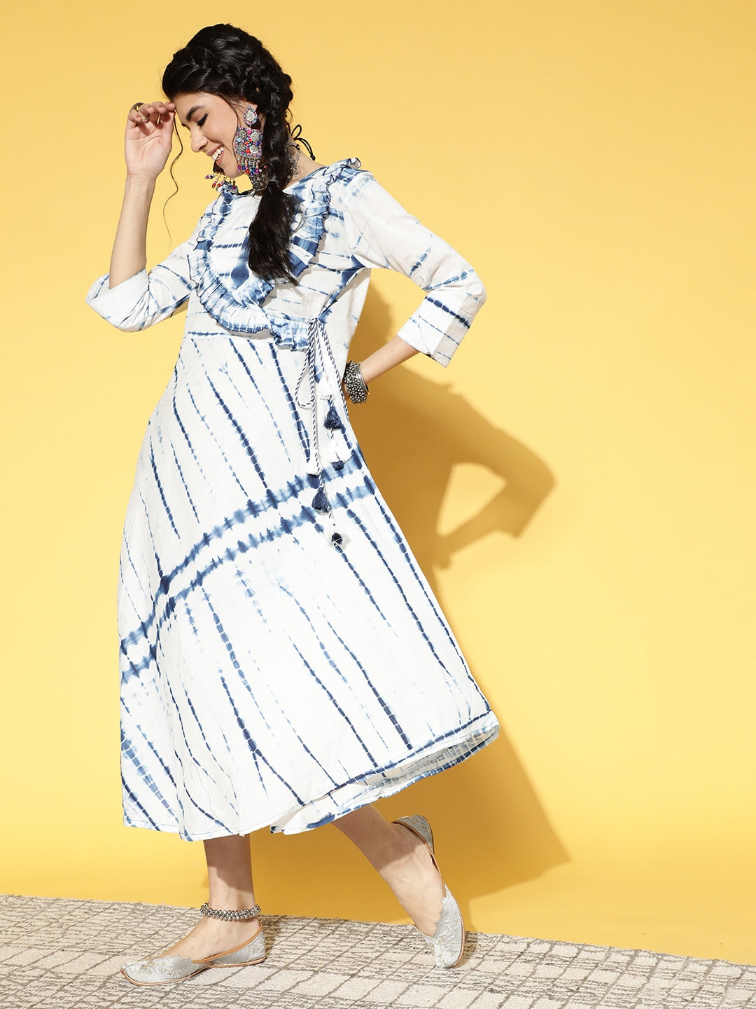 Turn heads with the exquisite white & blue tie-dyed dress. This beautiful dresses blends classic and contemporary designs, making it a versatile addition to your collection. Crafted with care, it promises both comfort and elegance. Discover the allure of ethnic dress Indian